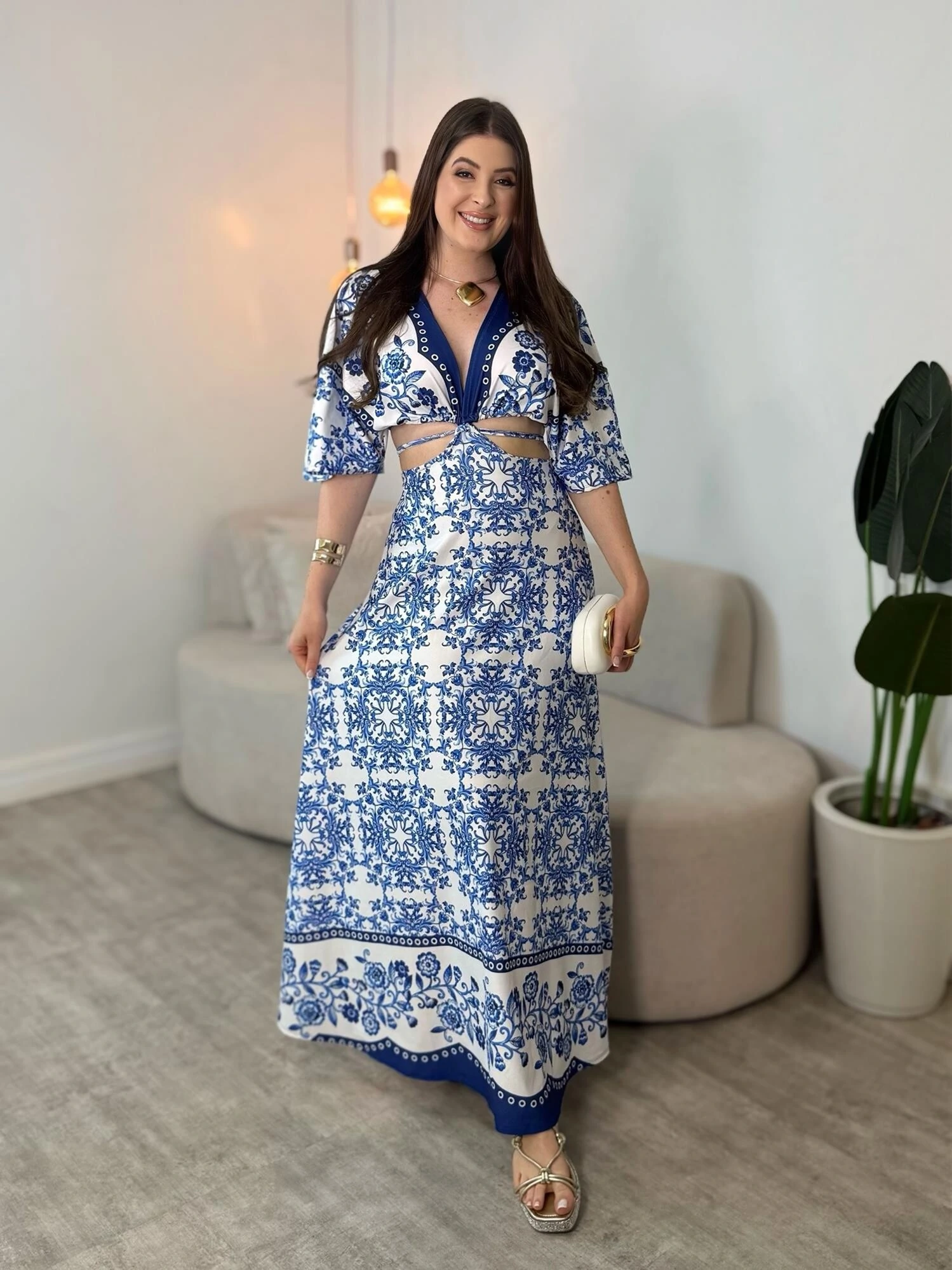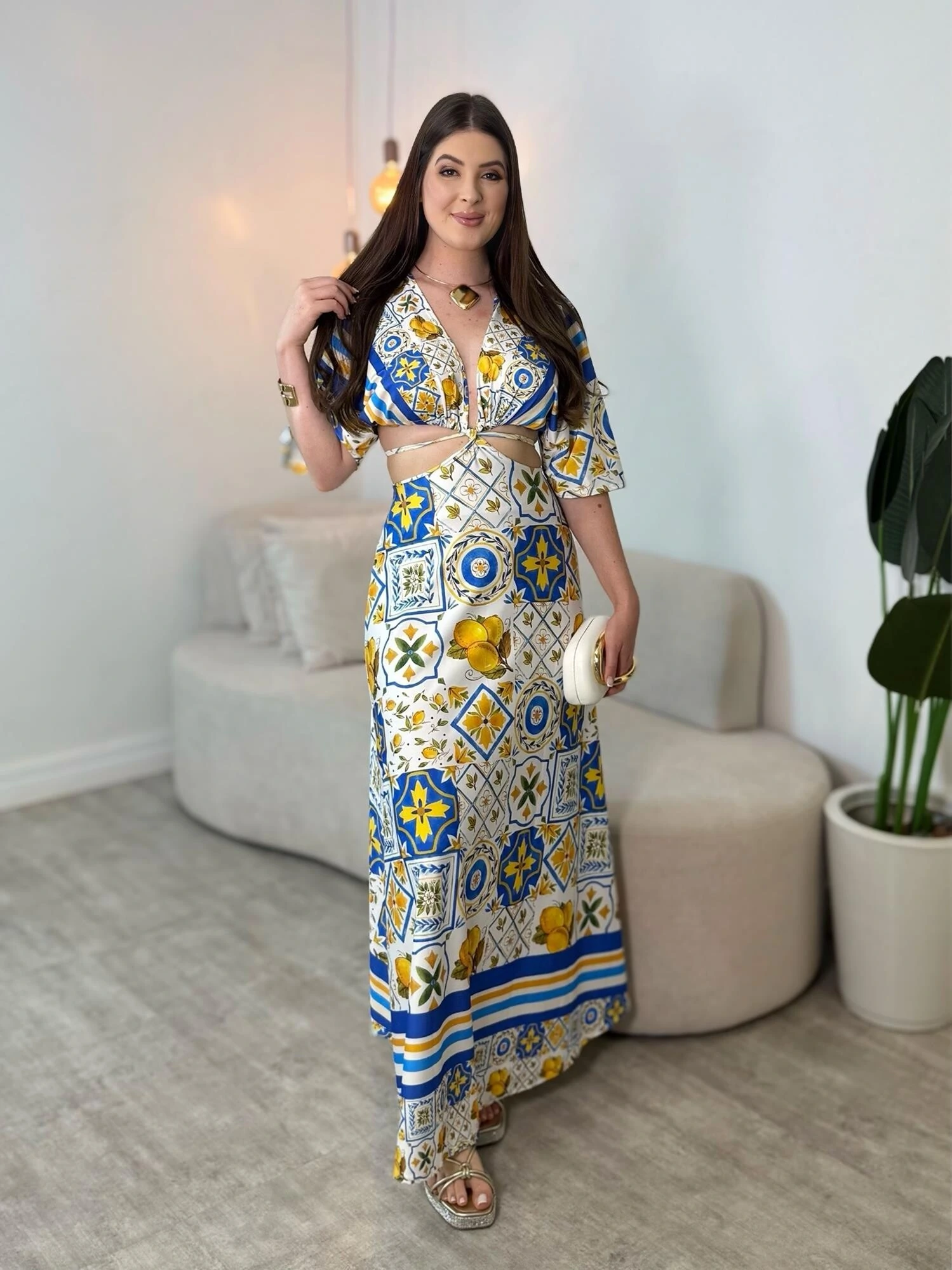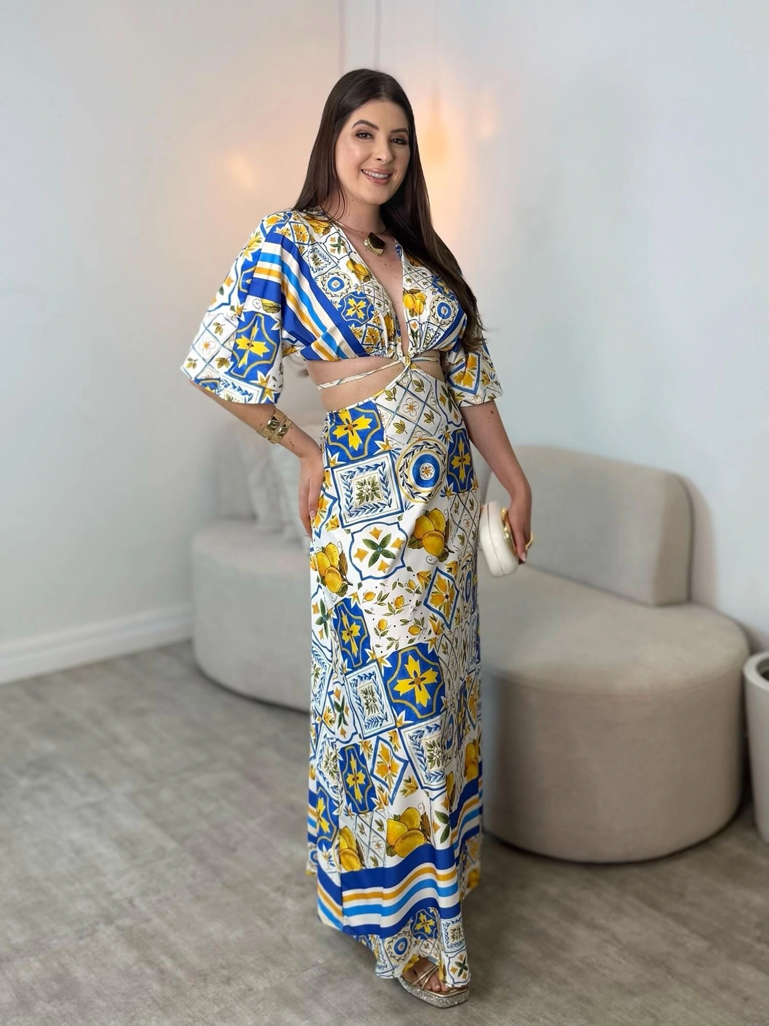 Não possui bojo, possui decote em V, possui abertura na cintura, possui detalhe em amarração na cintura, modelo mais solto.