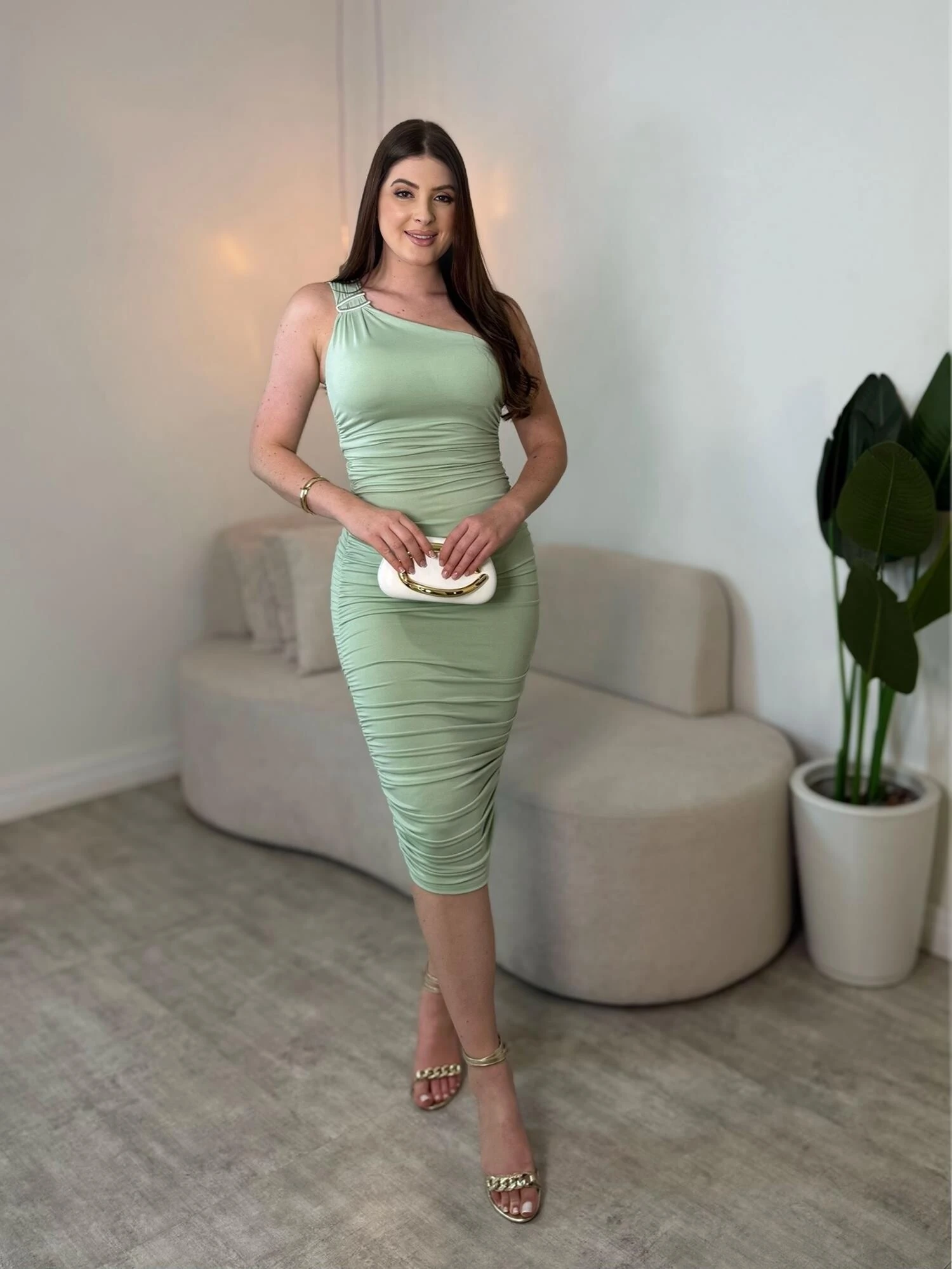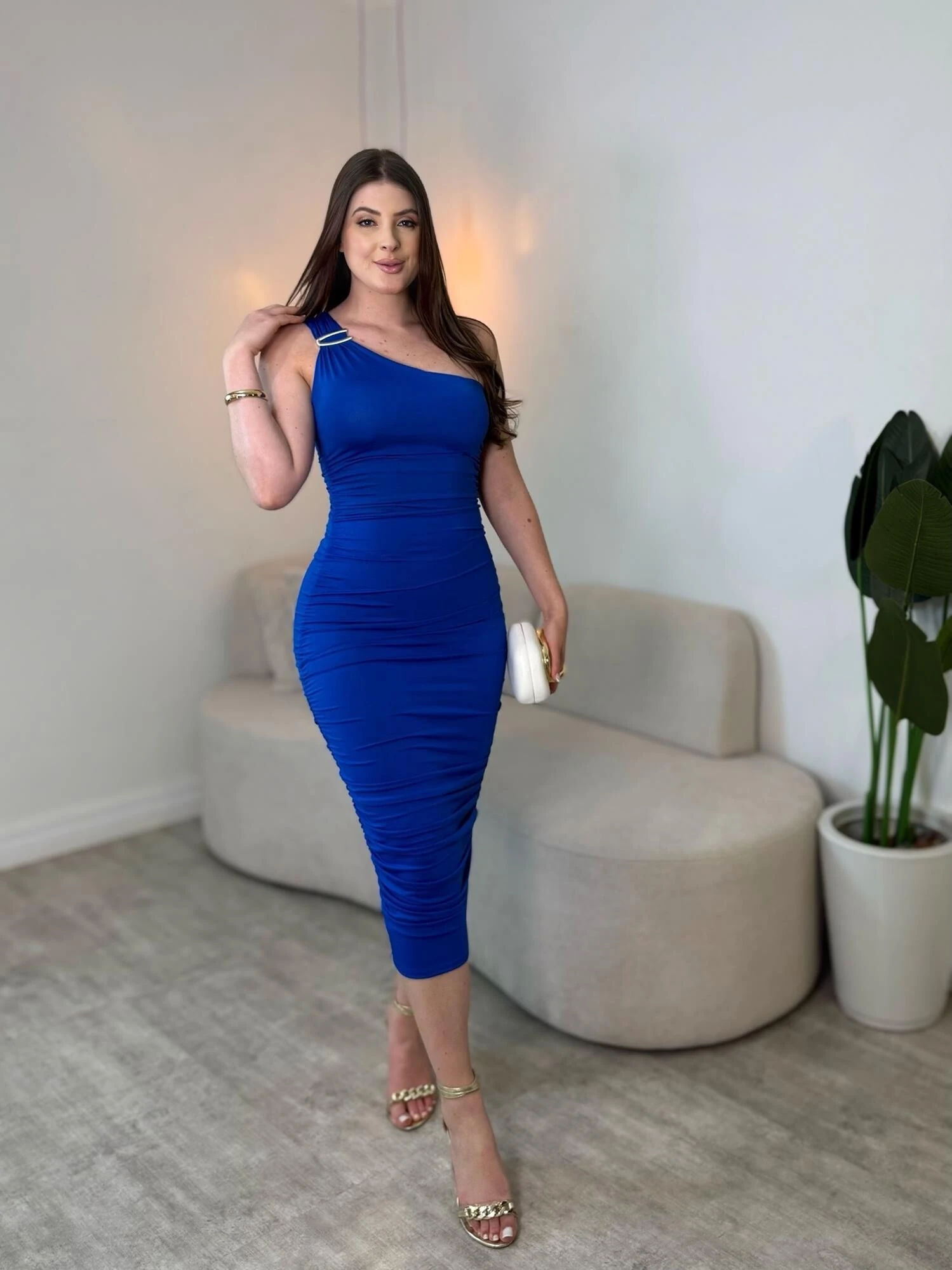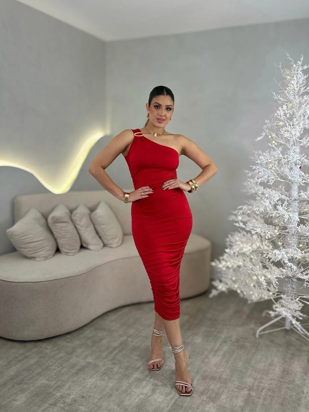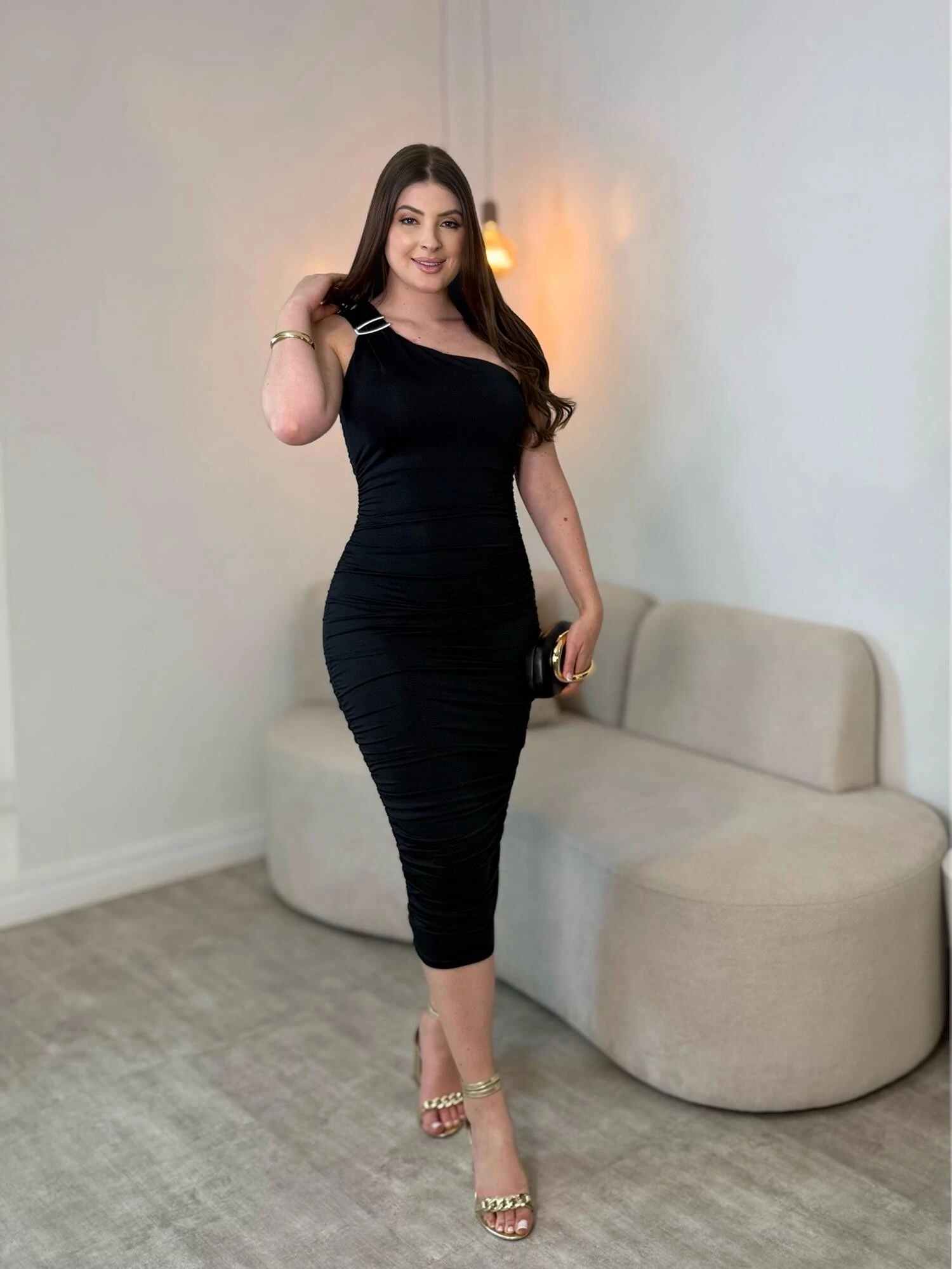 Vestido midi com uma manga só, com detalhe em acessório no ombro. Com drapeado nas laterias, modelagem se ajusta ao corpo.