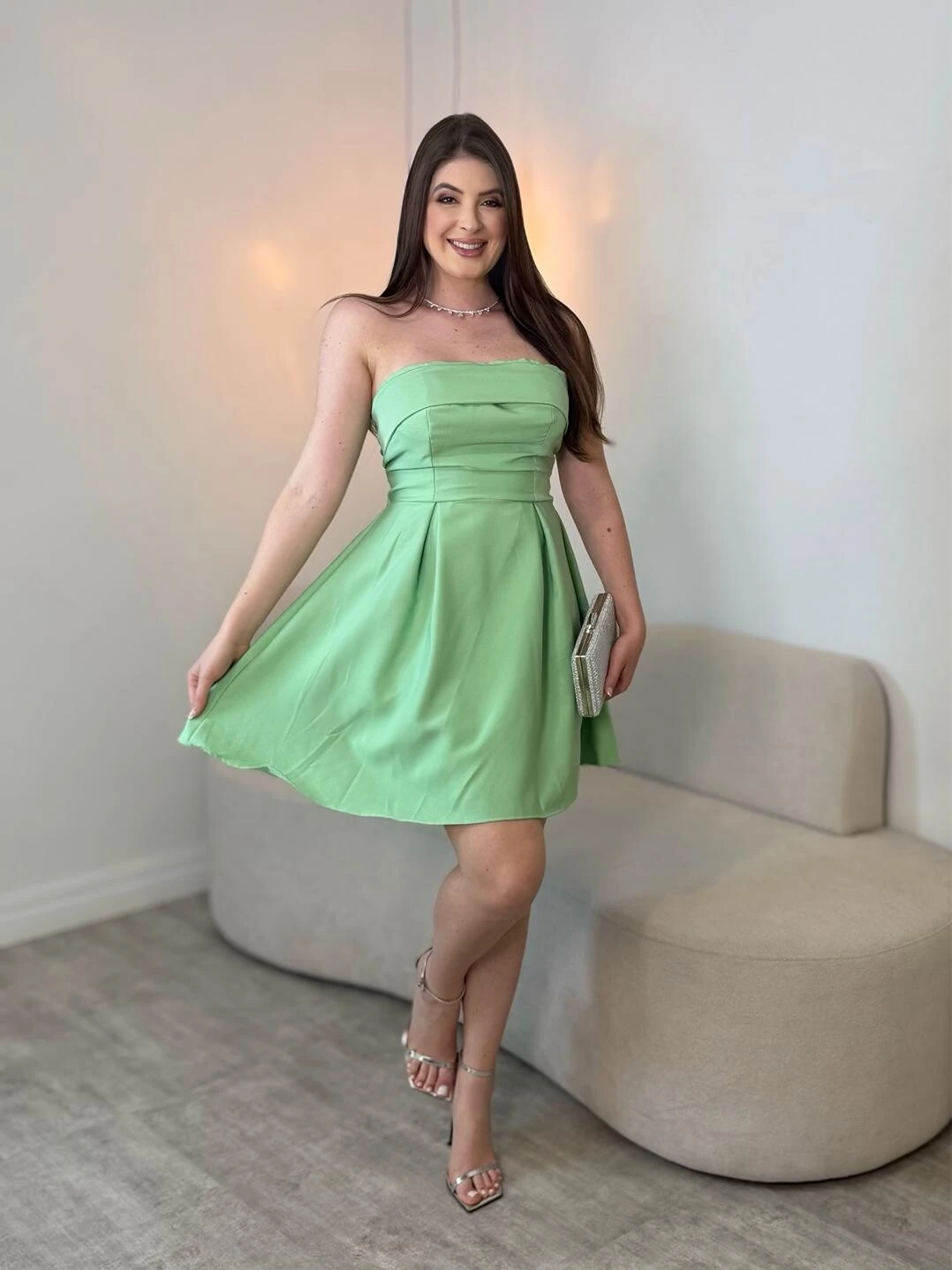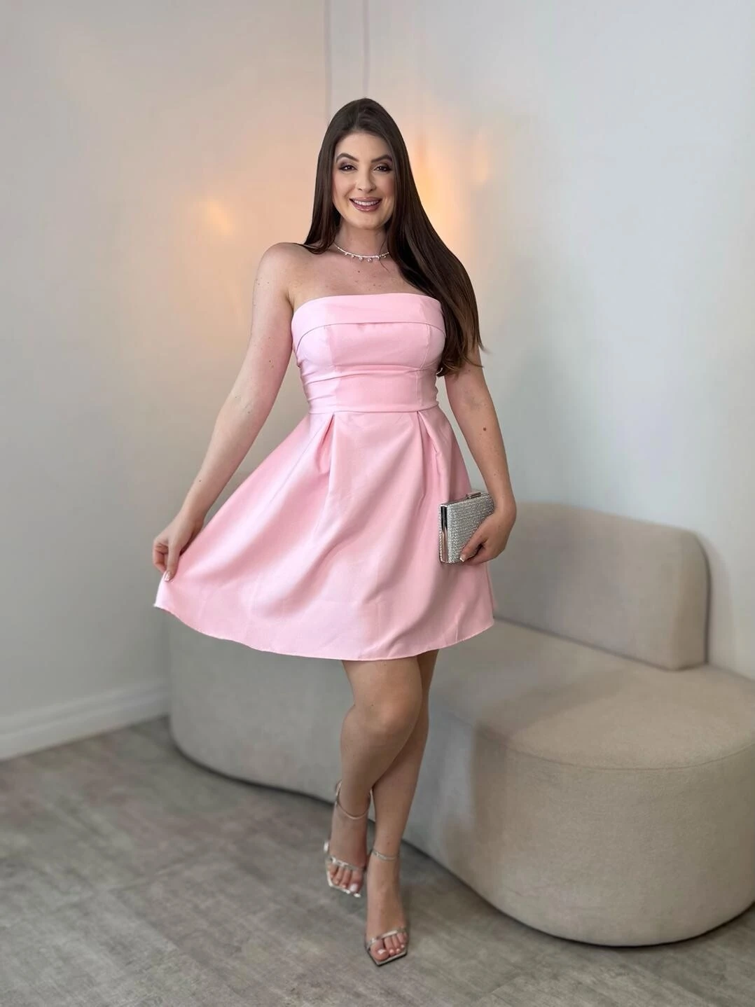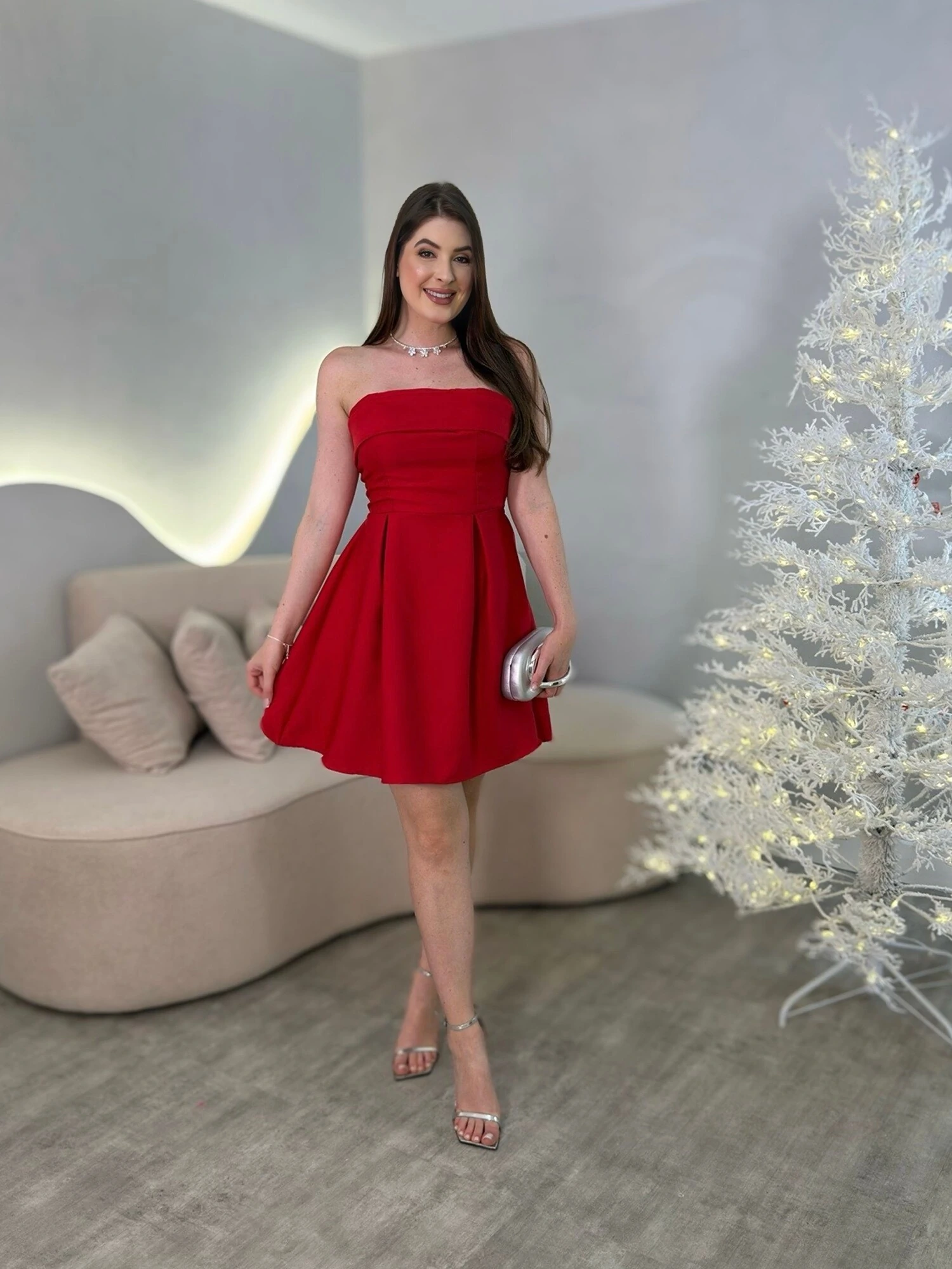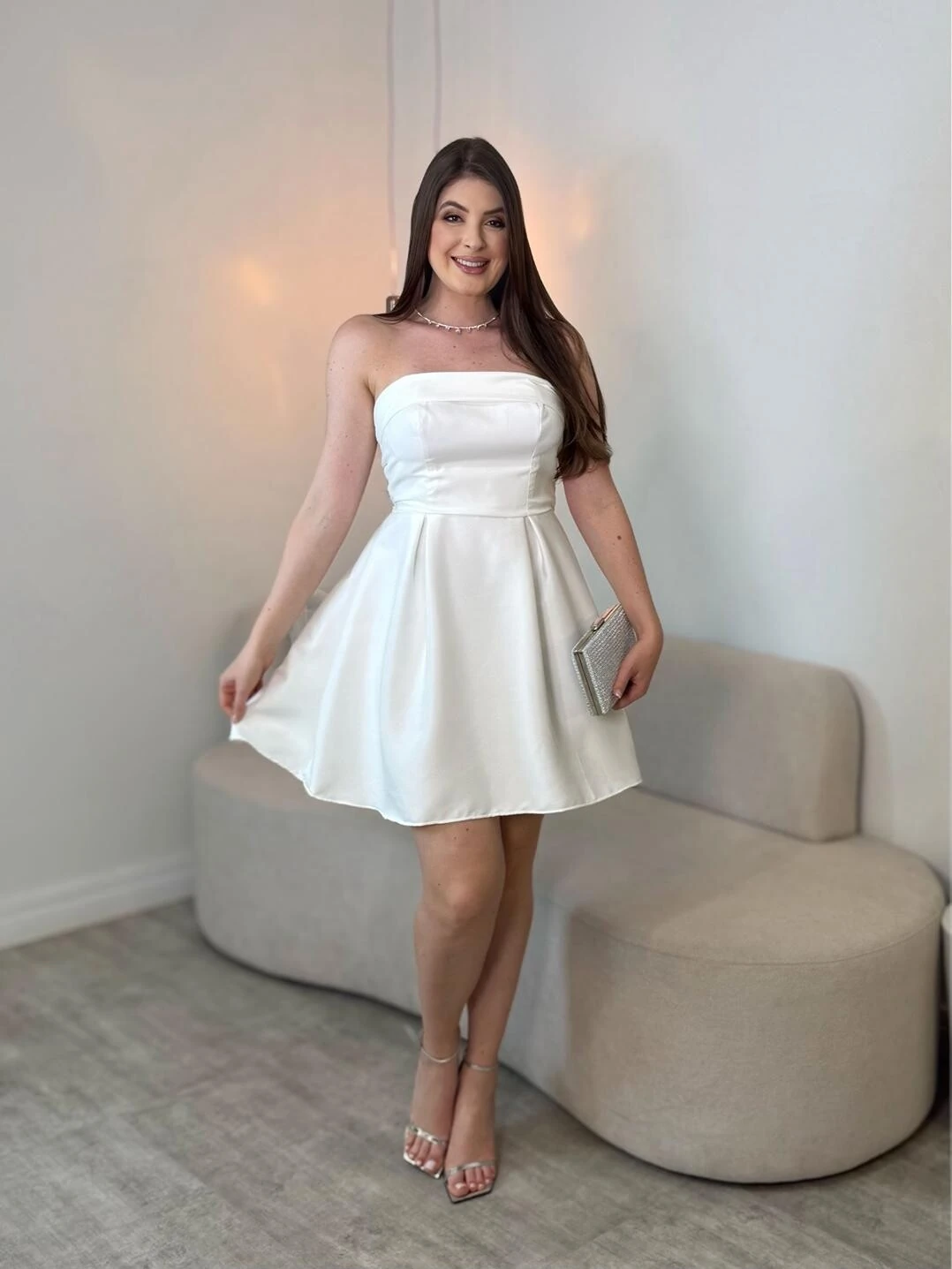 Vestido curto tomara que caia, com amarração nas costas.