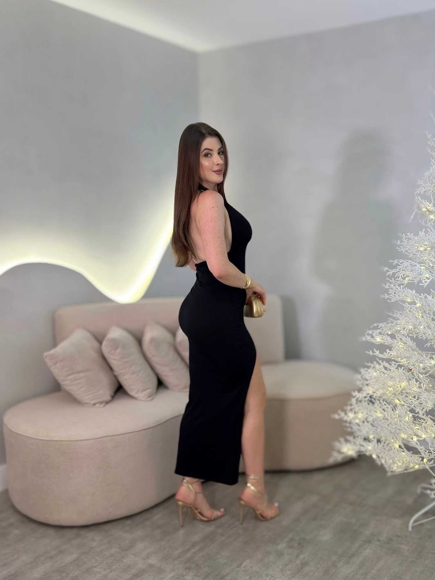 Vestido longo com amarração no pescoço, com bojo e decote em V. Modelo com fenda, tecido canelado. Modelagem justa.