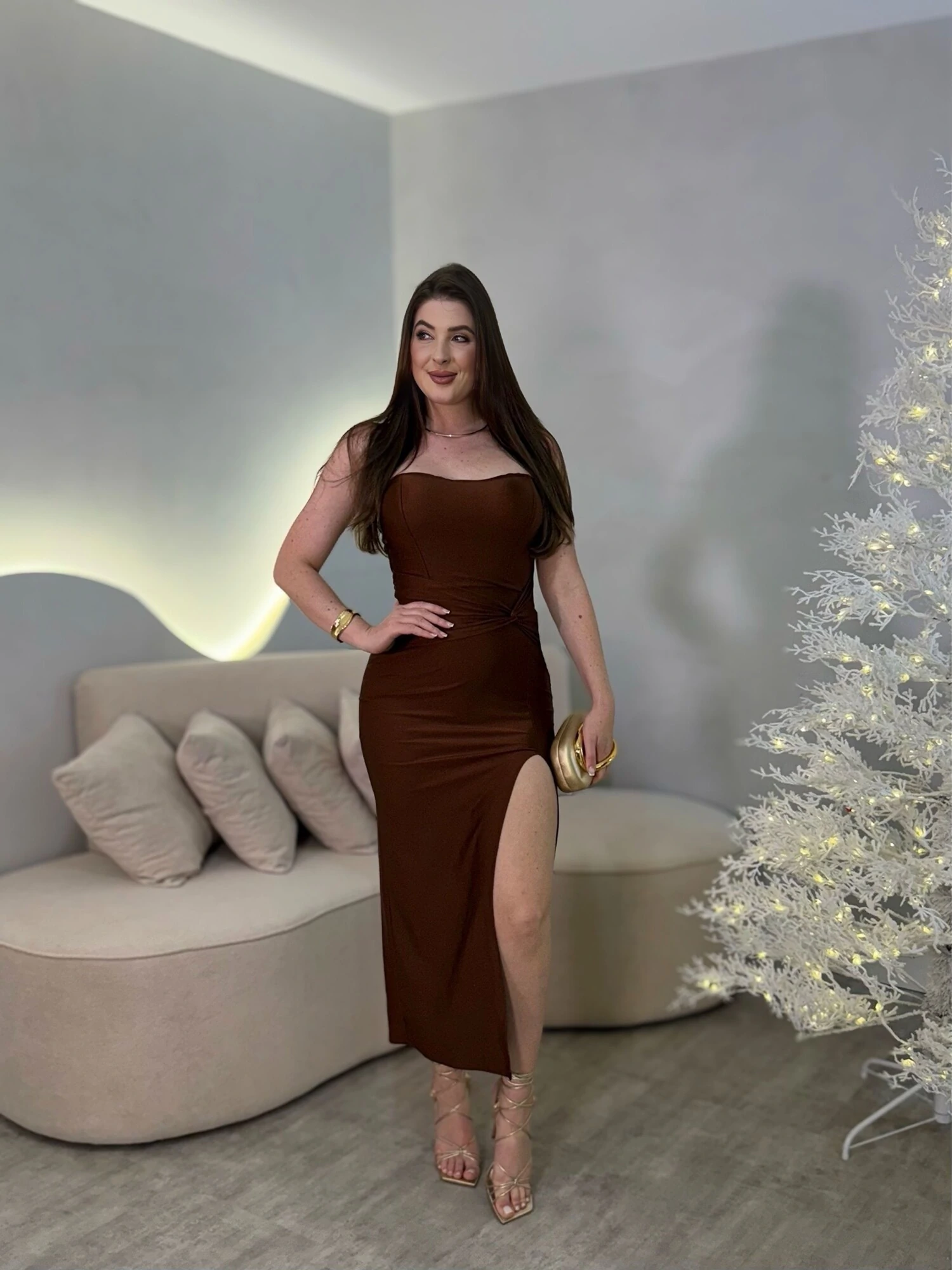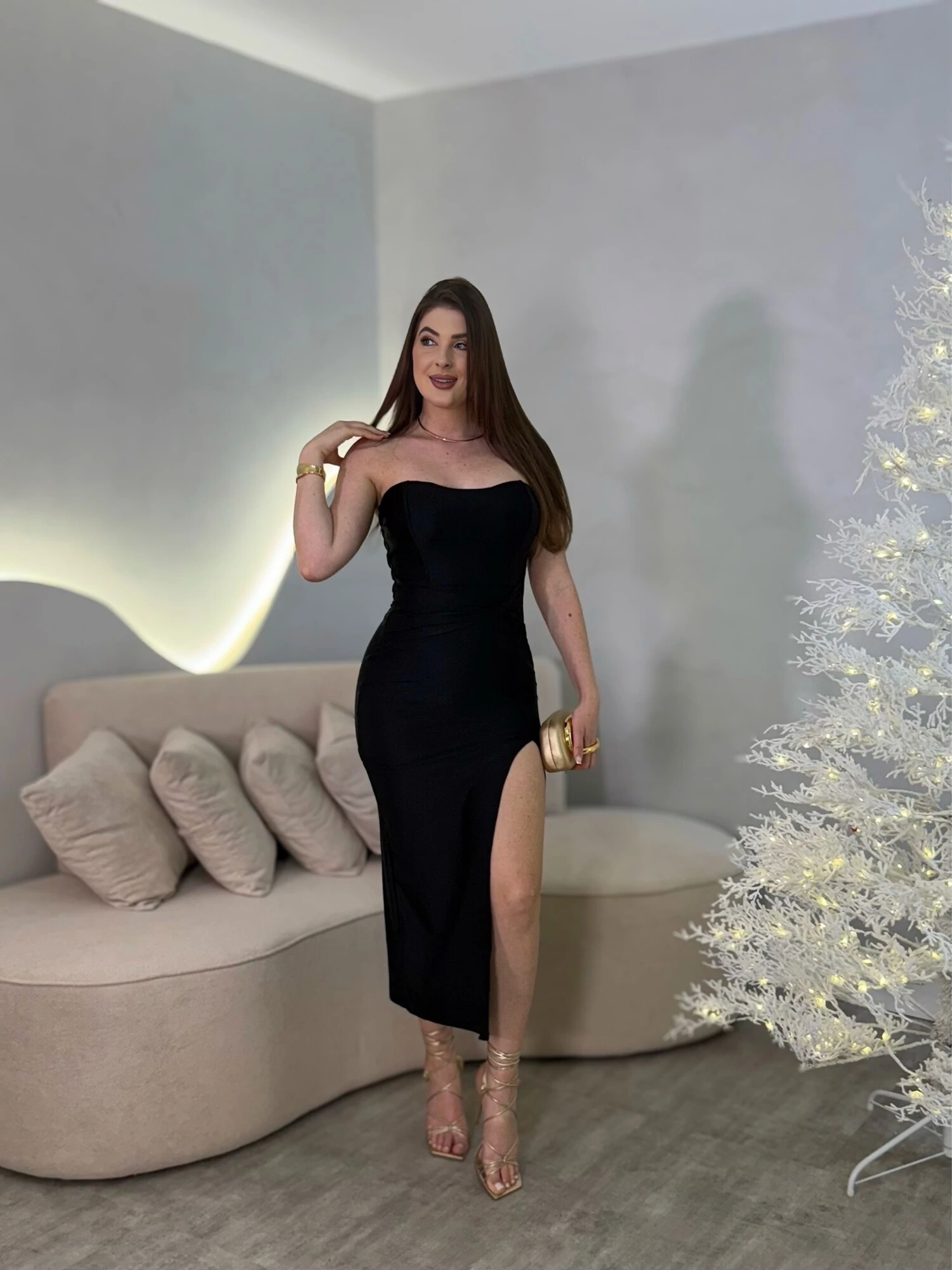 Vestido Midi tomara que caia, detalhe na cintura. Modelo justo com fenda na lateral.