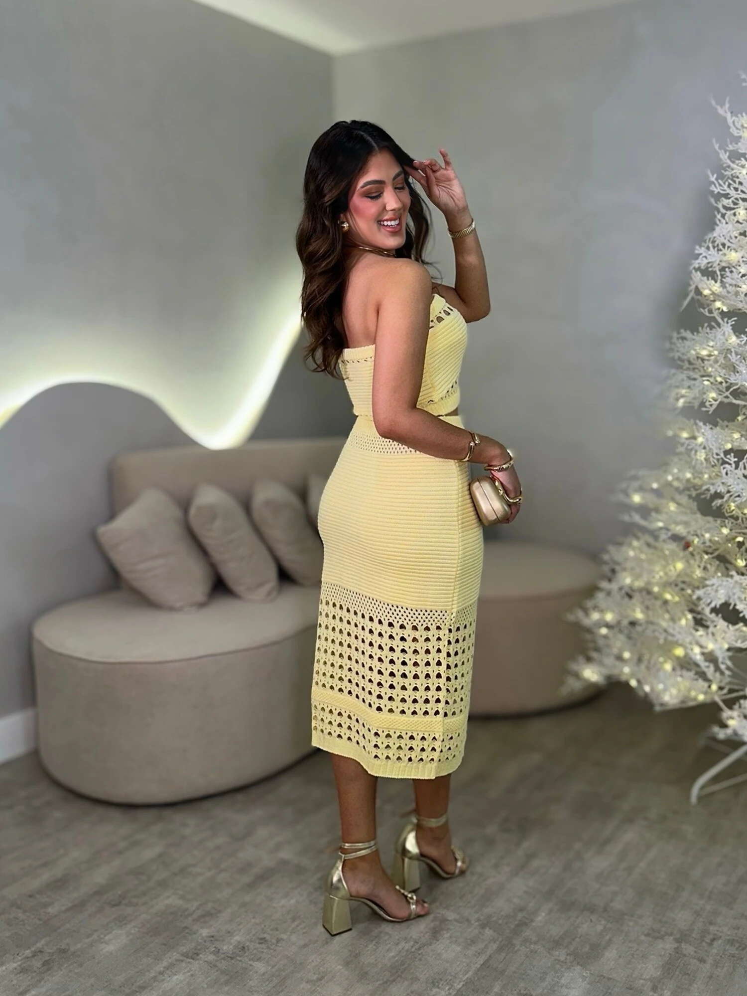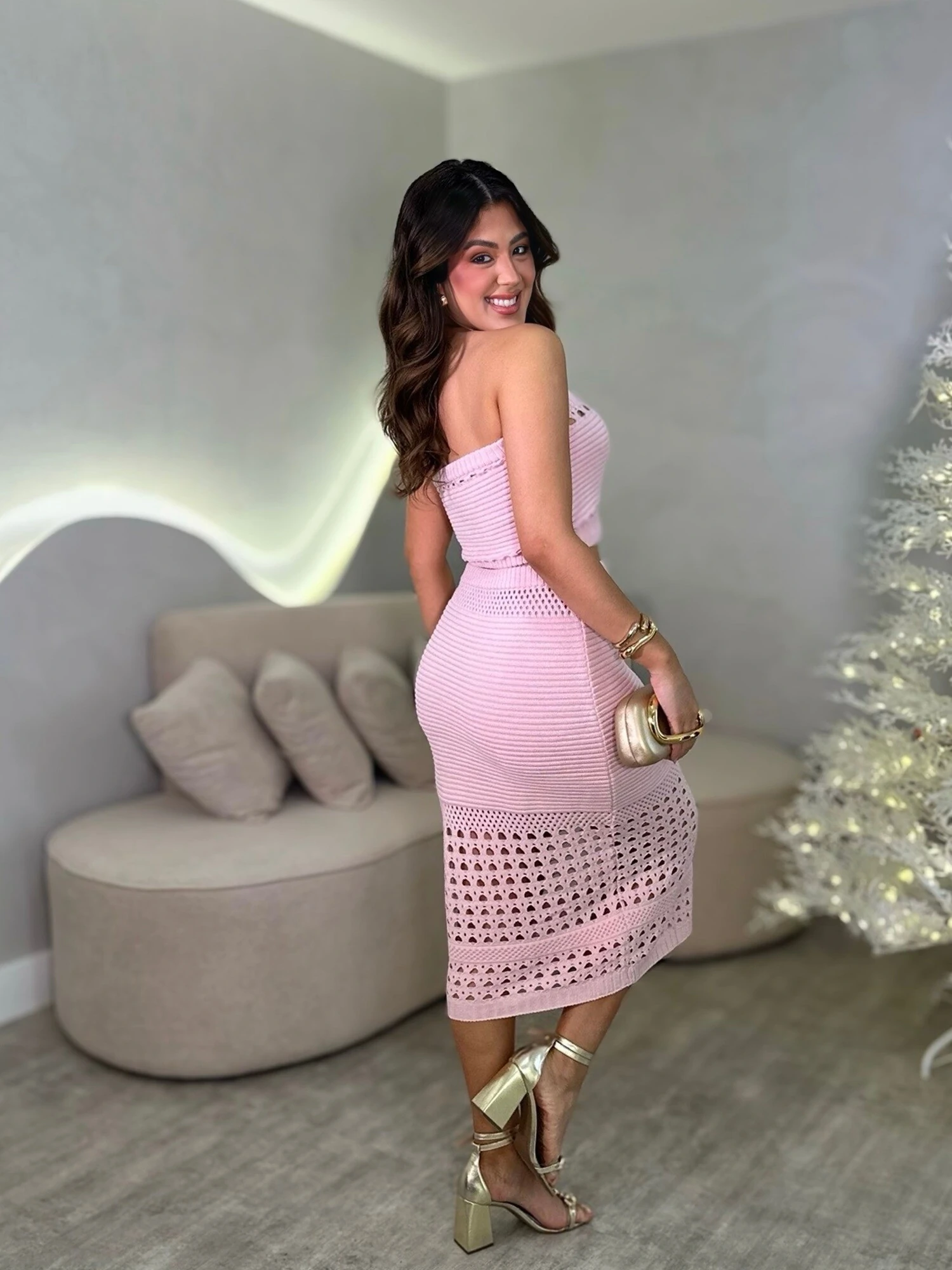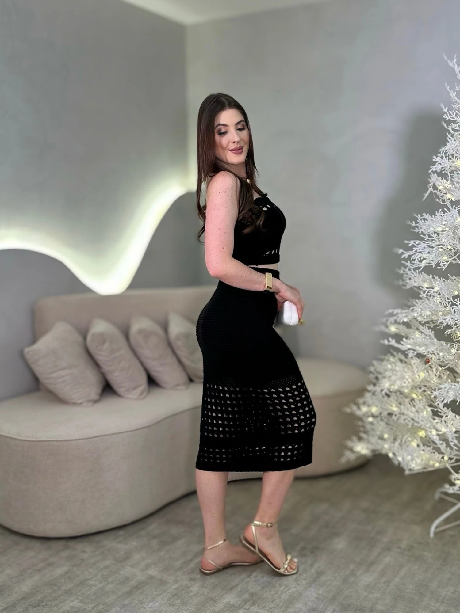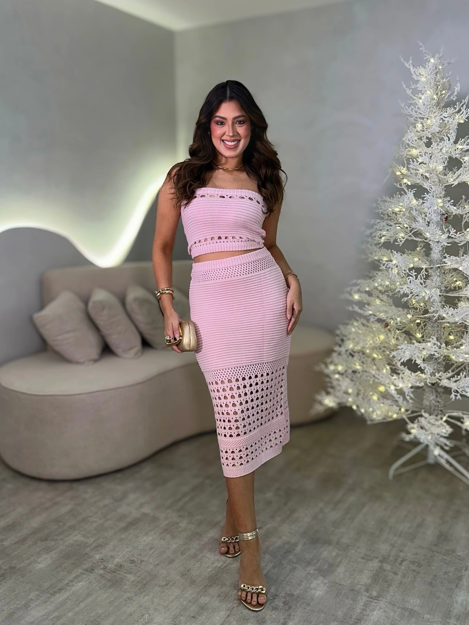 Conjunto Tricot Modal, Com Cropped Tomara Que Caia e Saia Midi. Modelo Com Detalhes Vazados.