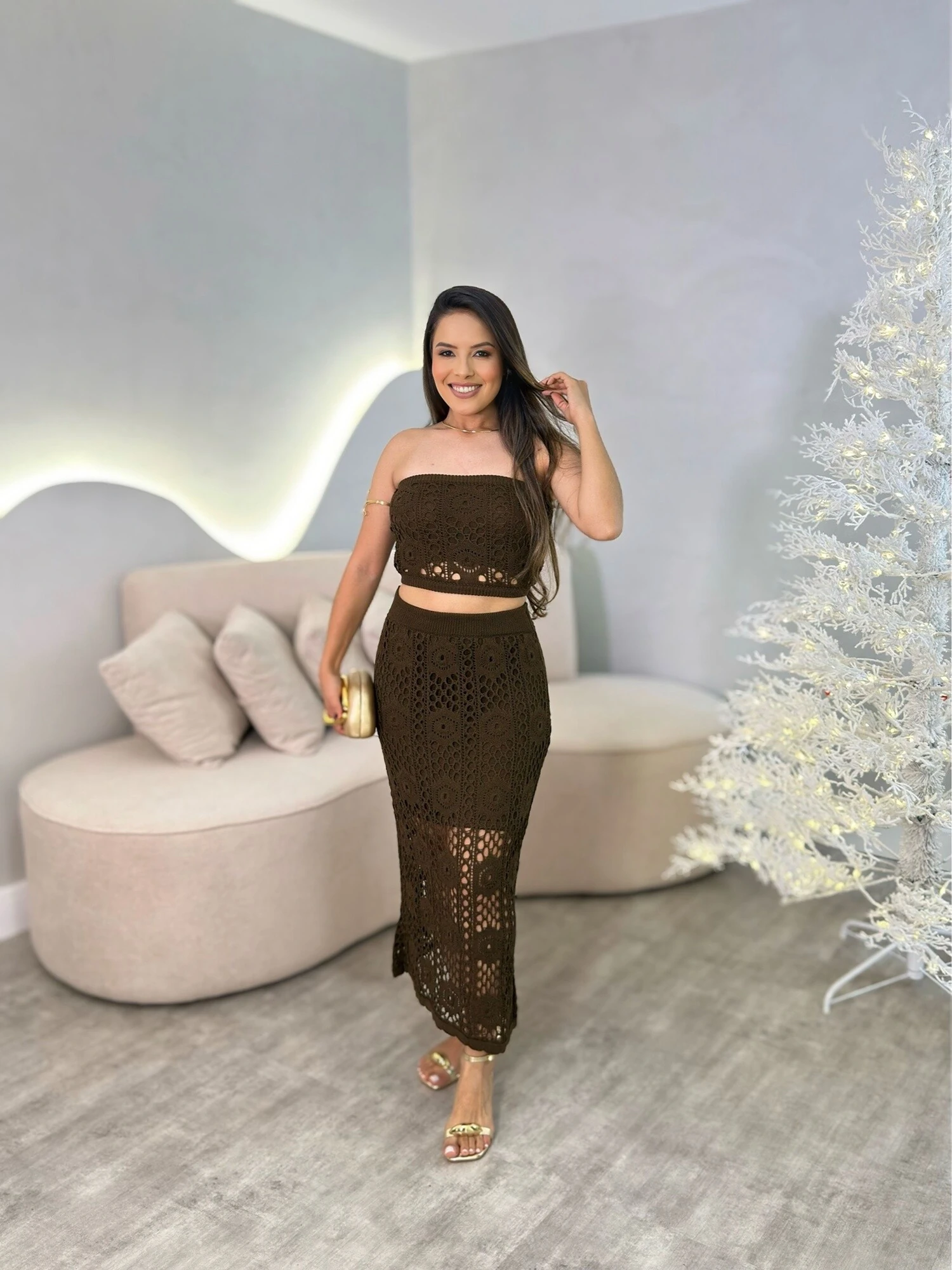 Conjunto Tricot Modal, Cropped e Saia Midi. Modelo Com Detalhes Vazados.