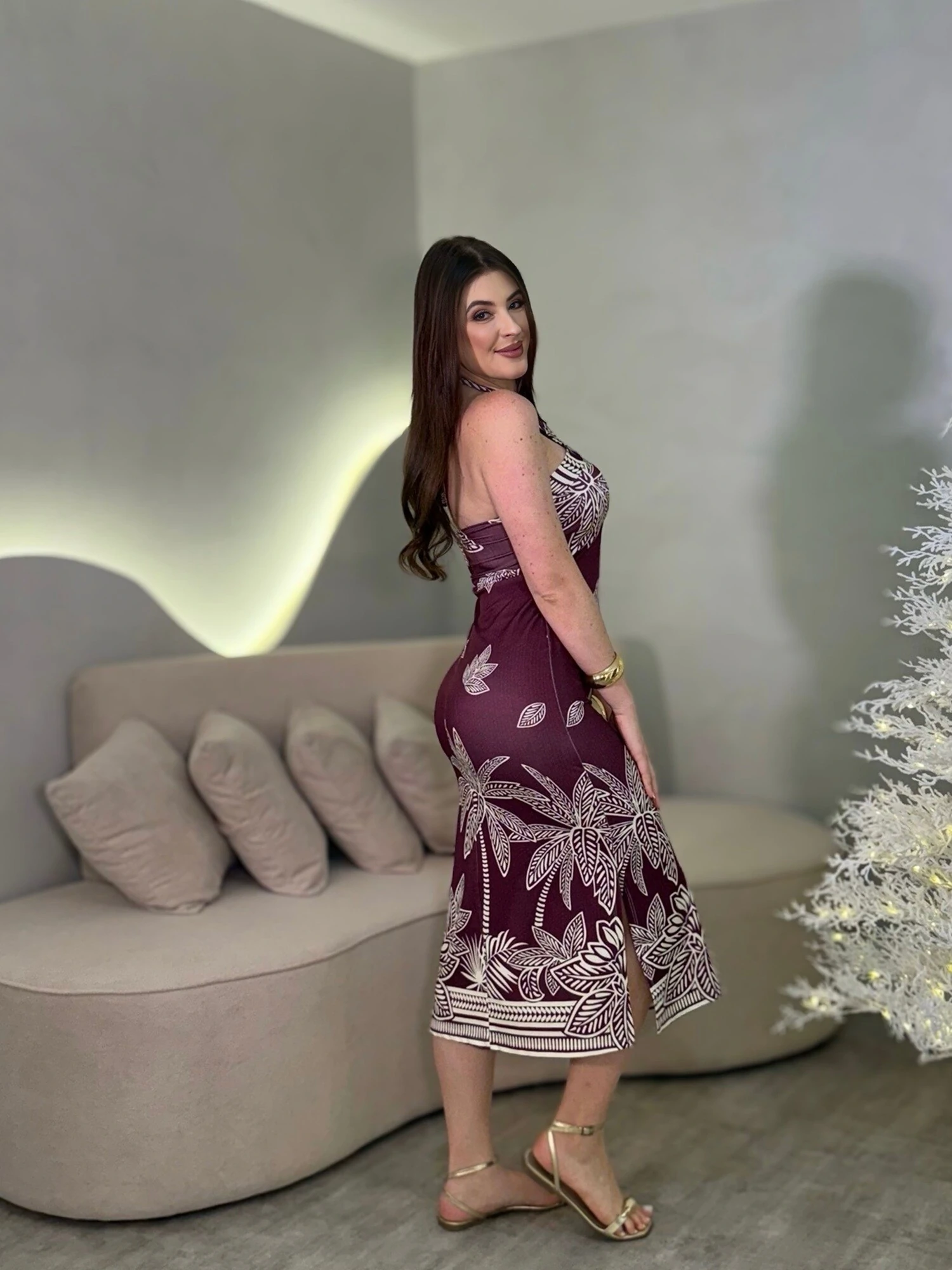 Vestido Midi Com Fenda Dupla Nas Laterais. Modelo Possui Detalhe Em Amarração No Pescoço.