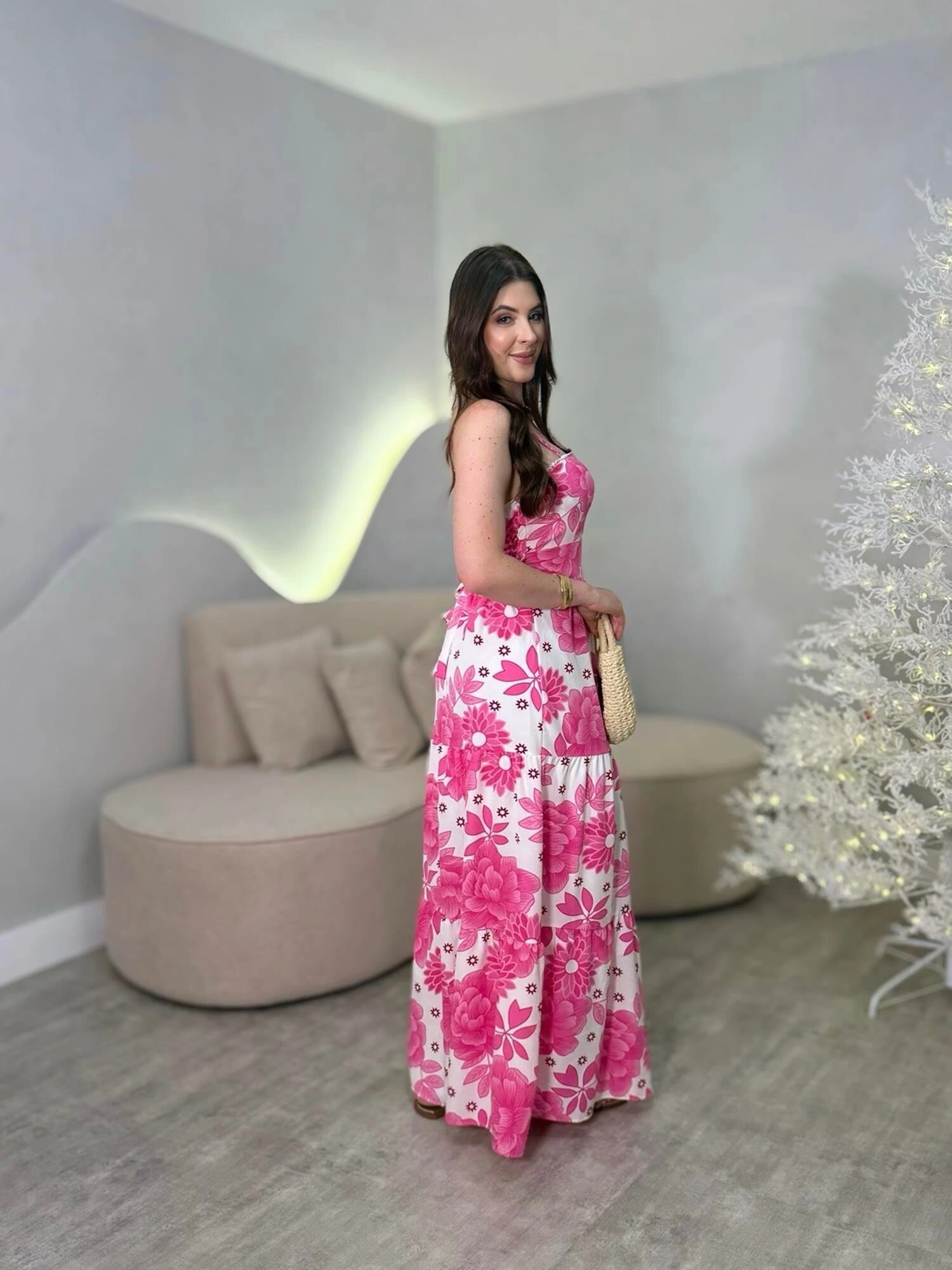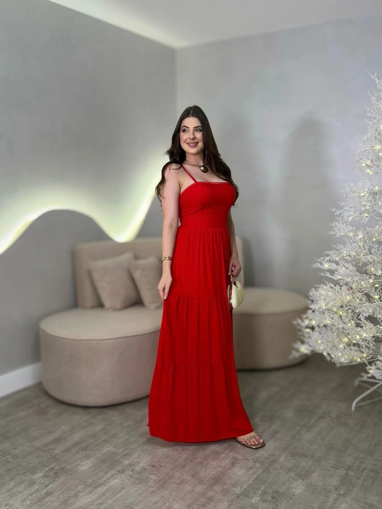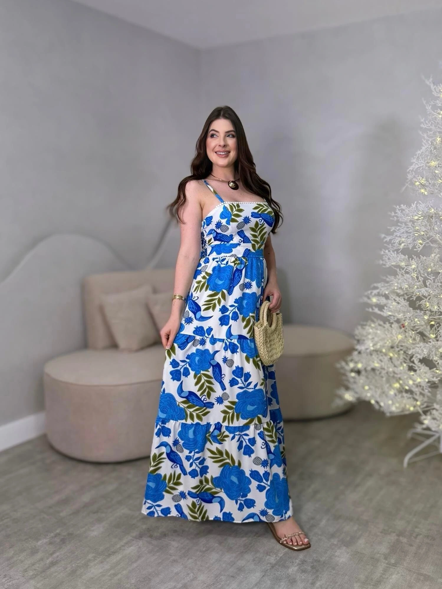 Vestido longo com bojo interno, alças ajustaveis, lastex nas costas, amarração na cintura. Modelagem solta.
