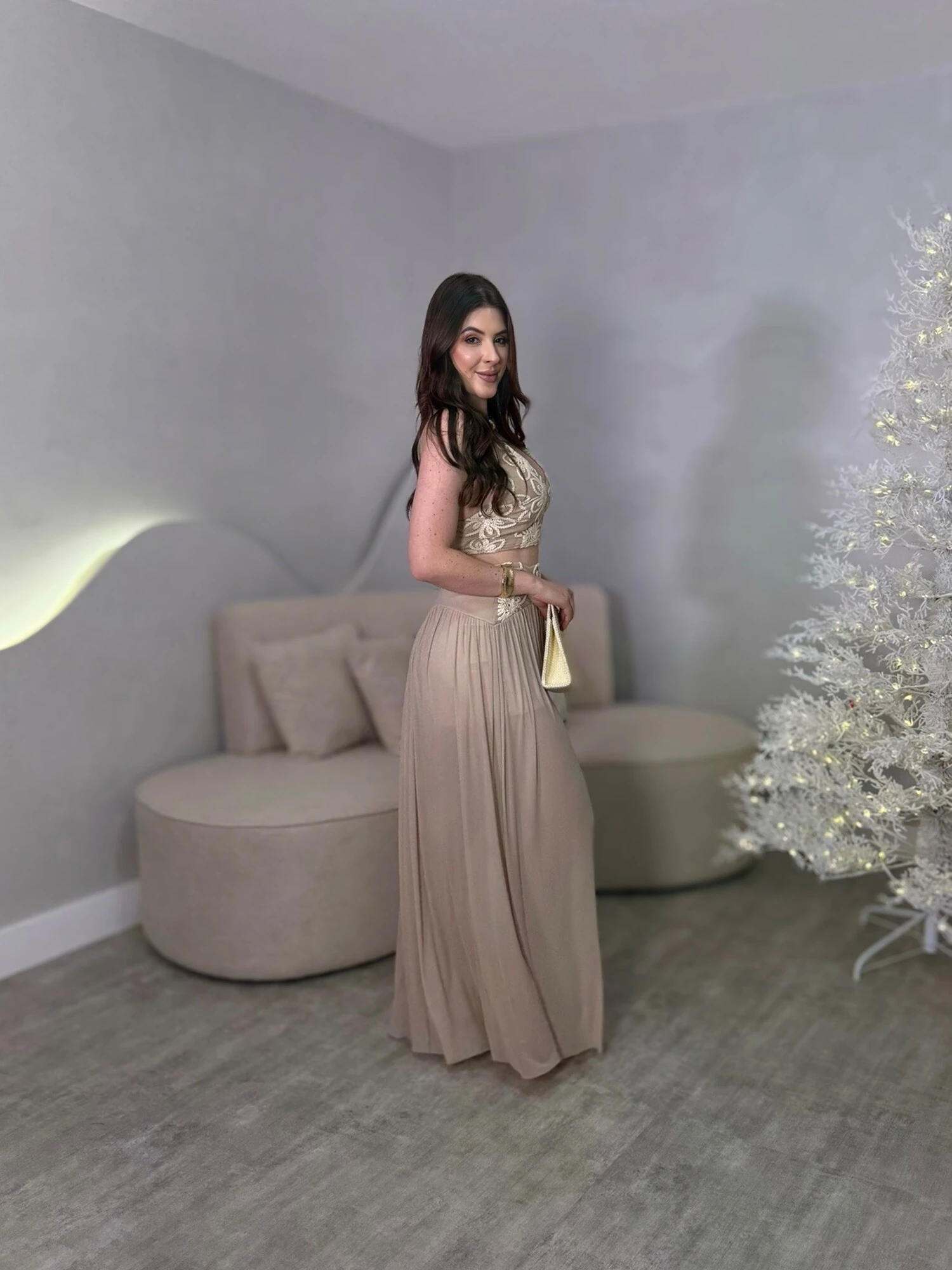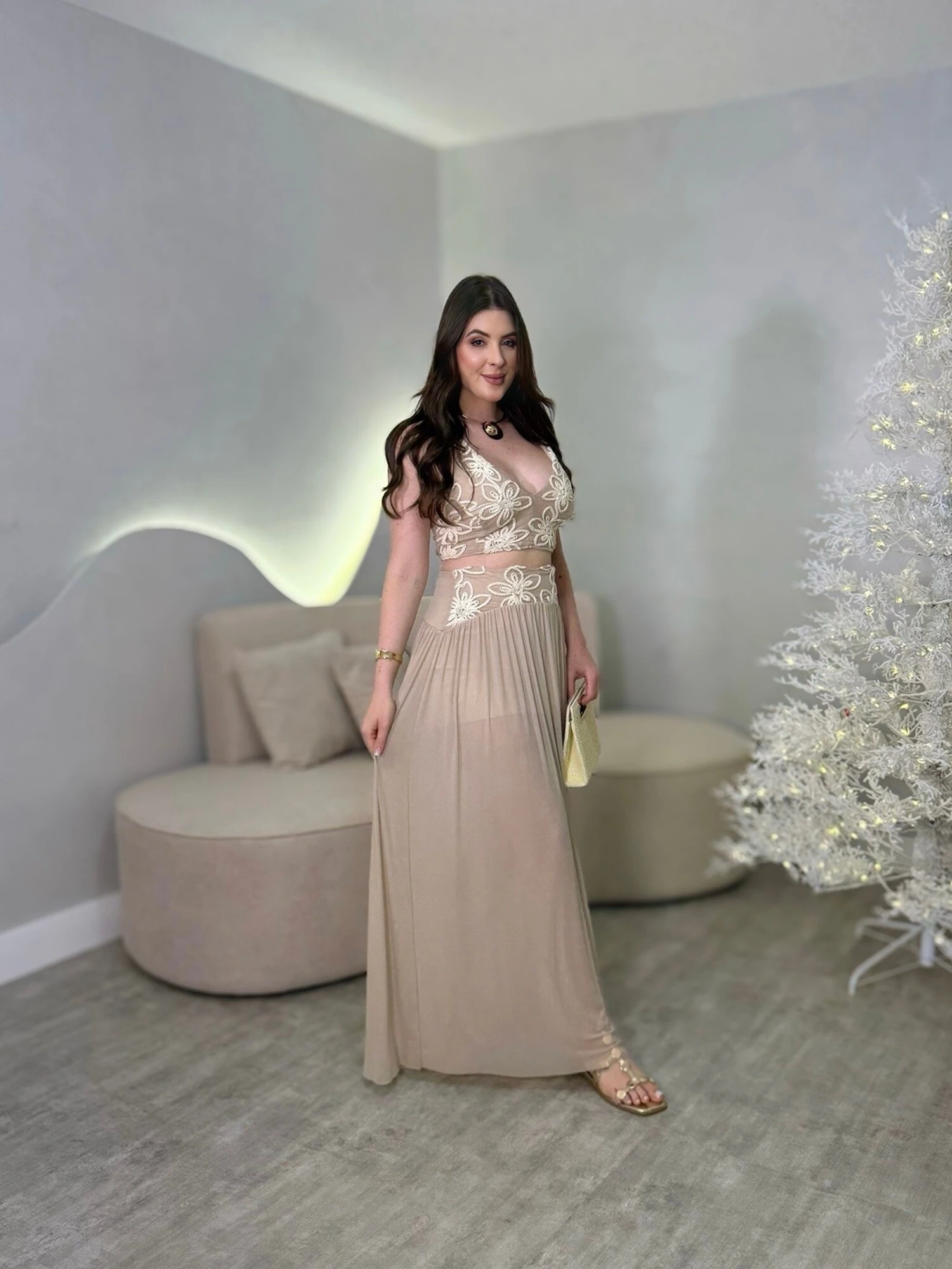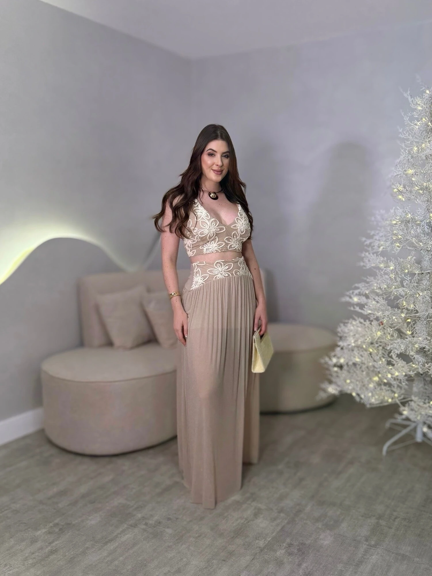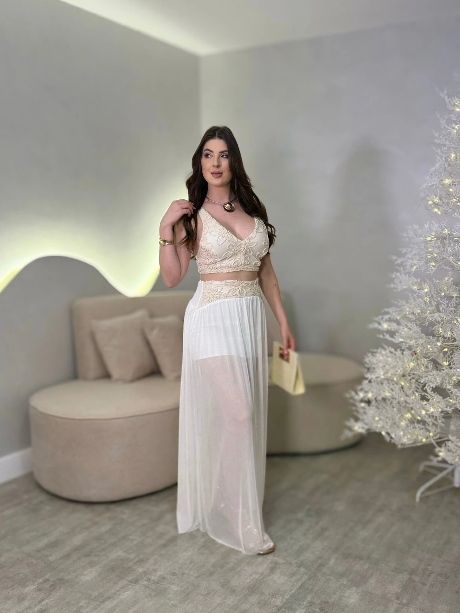 Conjunto Praiano Em Tecido Chiffon. Modelagem Com Detalhes Bordados Em Seu Comprimento.