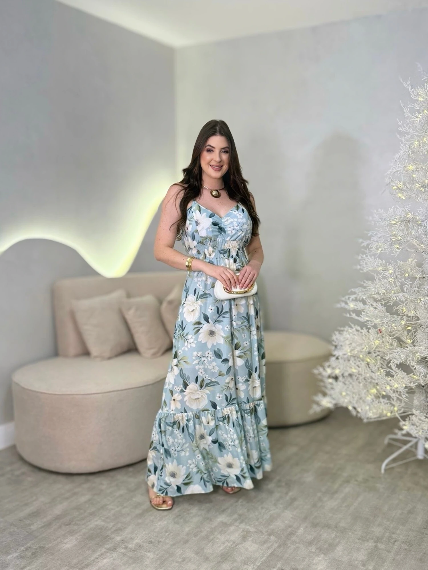 Vestido Longo Estampado, Com Modelagem Rodada. Possui Forramento Interno Evitando Transparência.