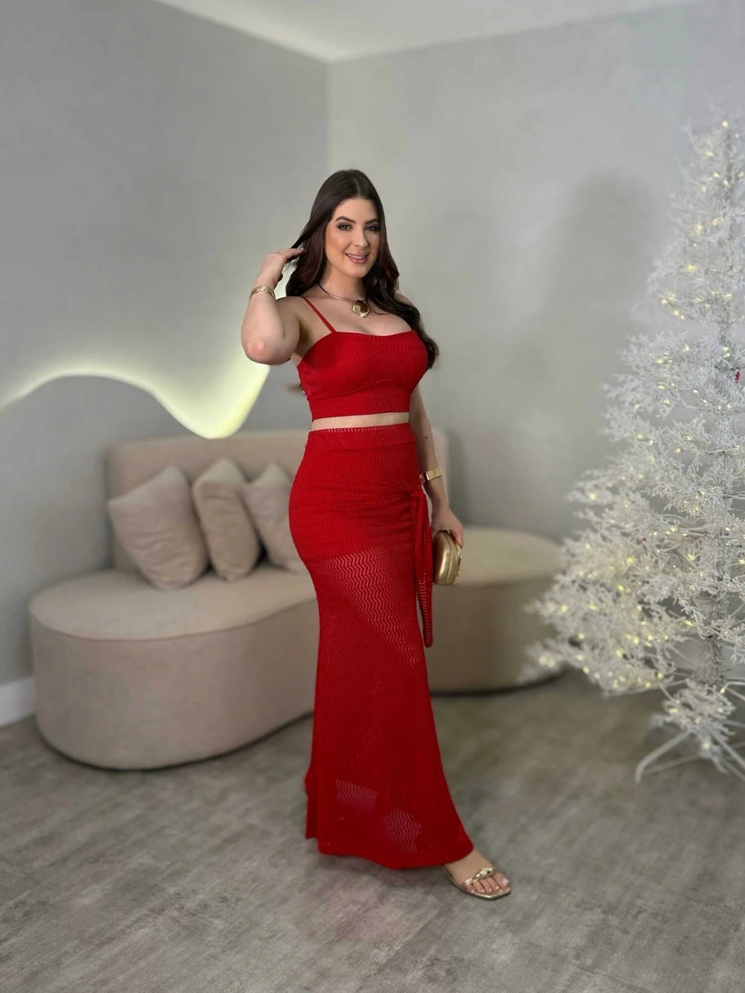 Conjunto Com Detalhes Vazados, Cropped + Saia Longa Com Amarração Na Cintura.
