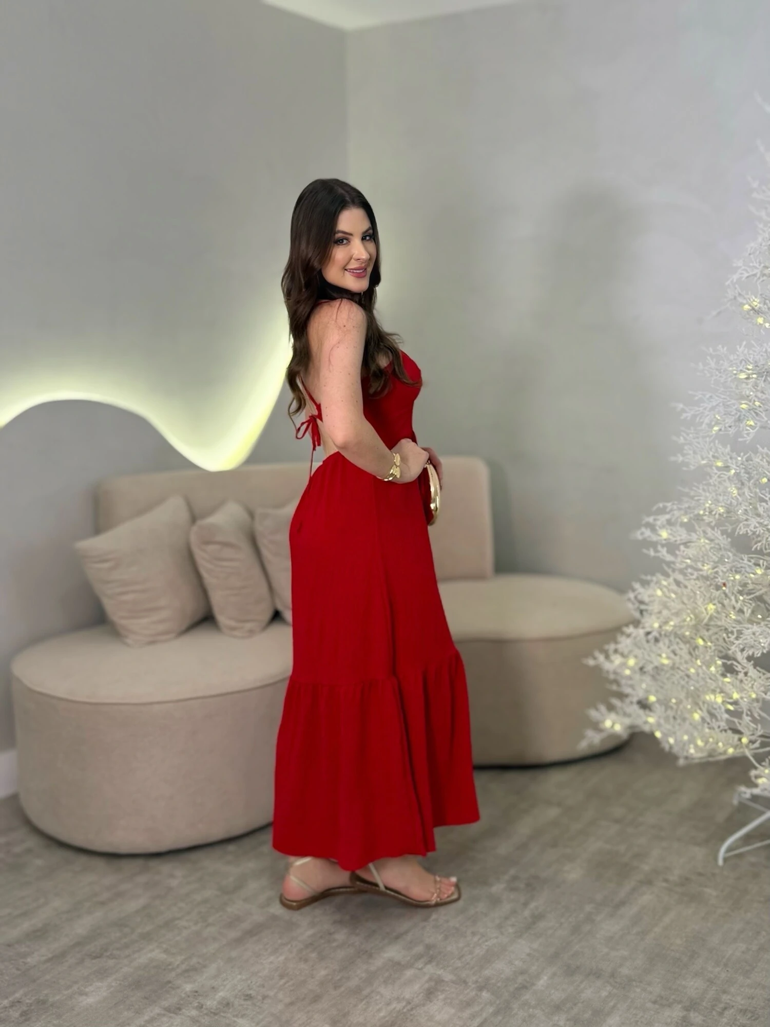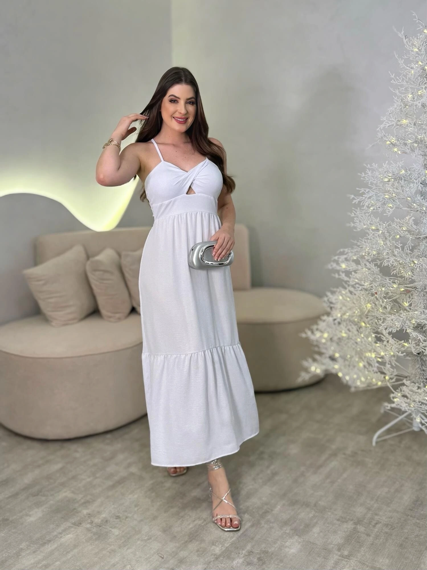 Vestido Longo Em Tecido Com Aspecto Brilhoso Em Seu Comprimento. Modelagem Com Amarração Nas Costas.
