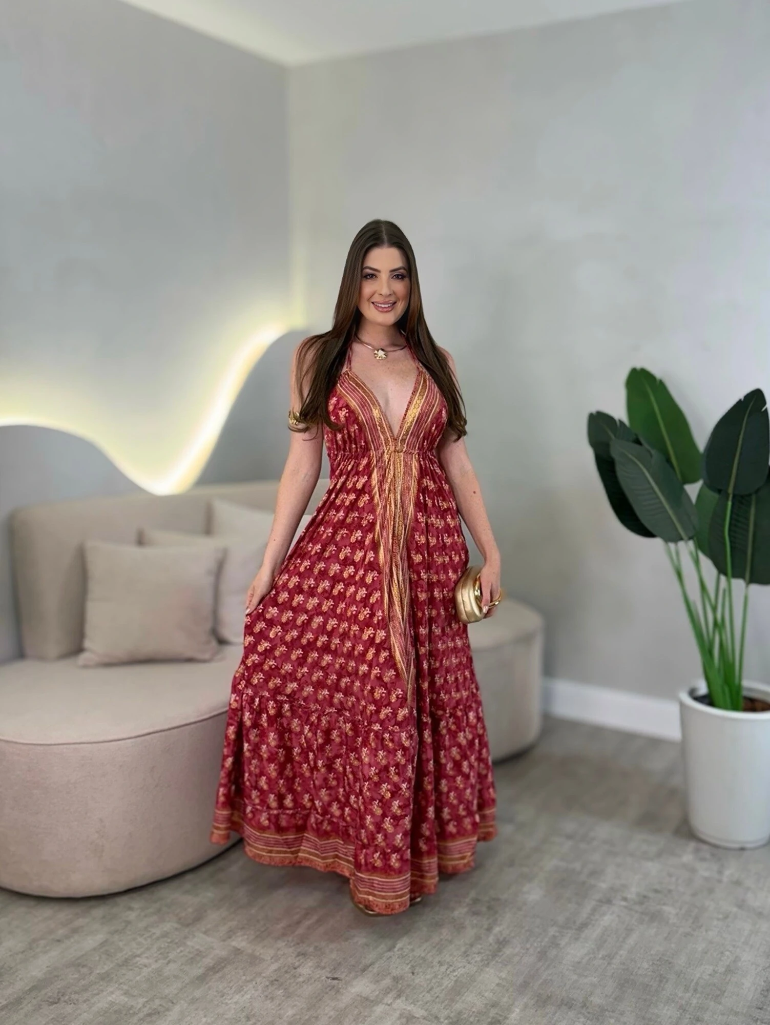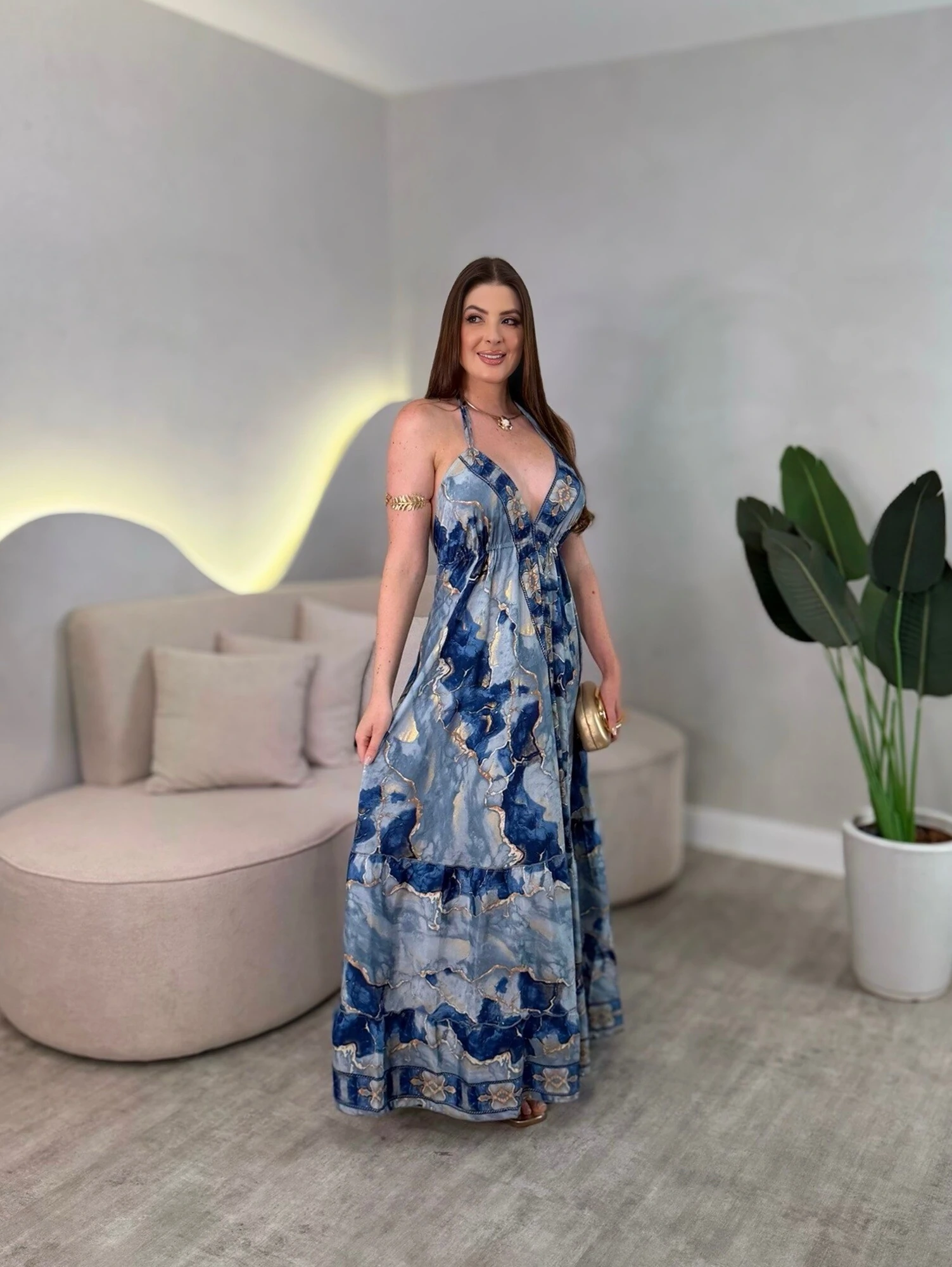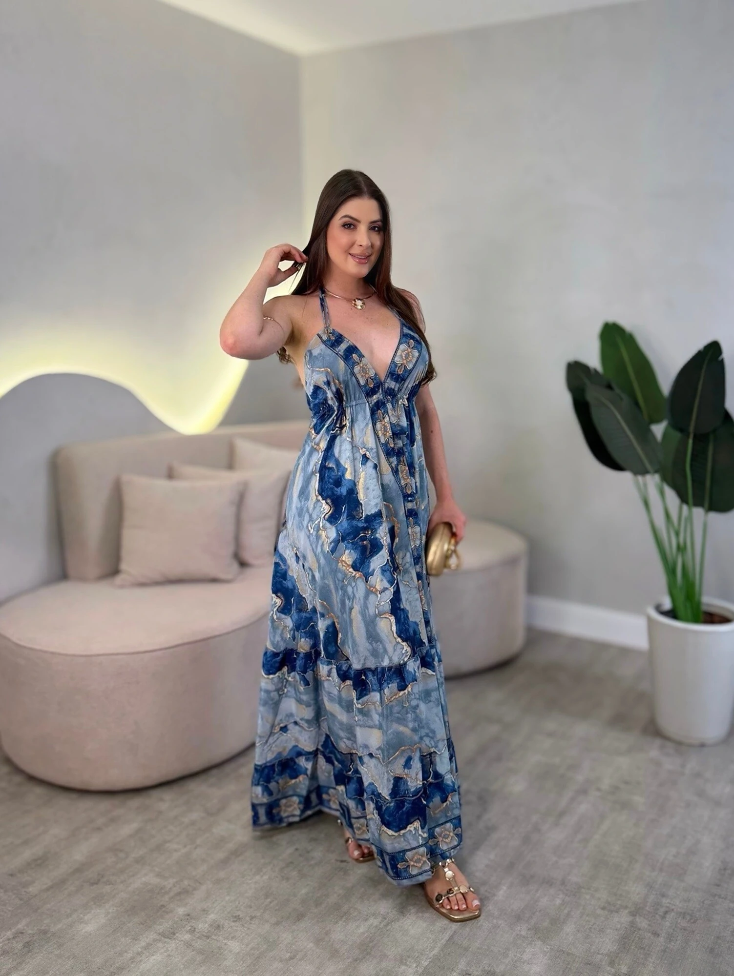 Vestido longo, com amarração no pescoço nas costas, modelagem solta.