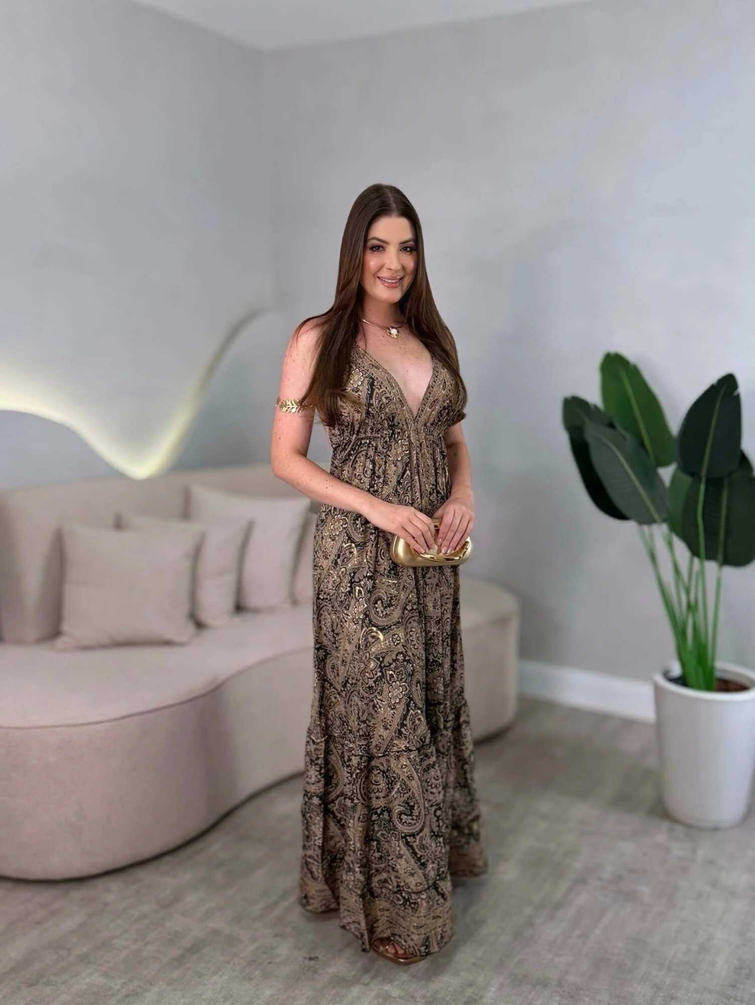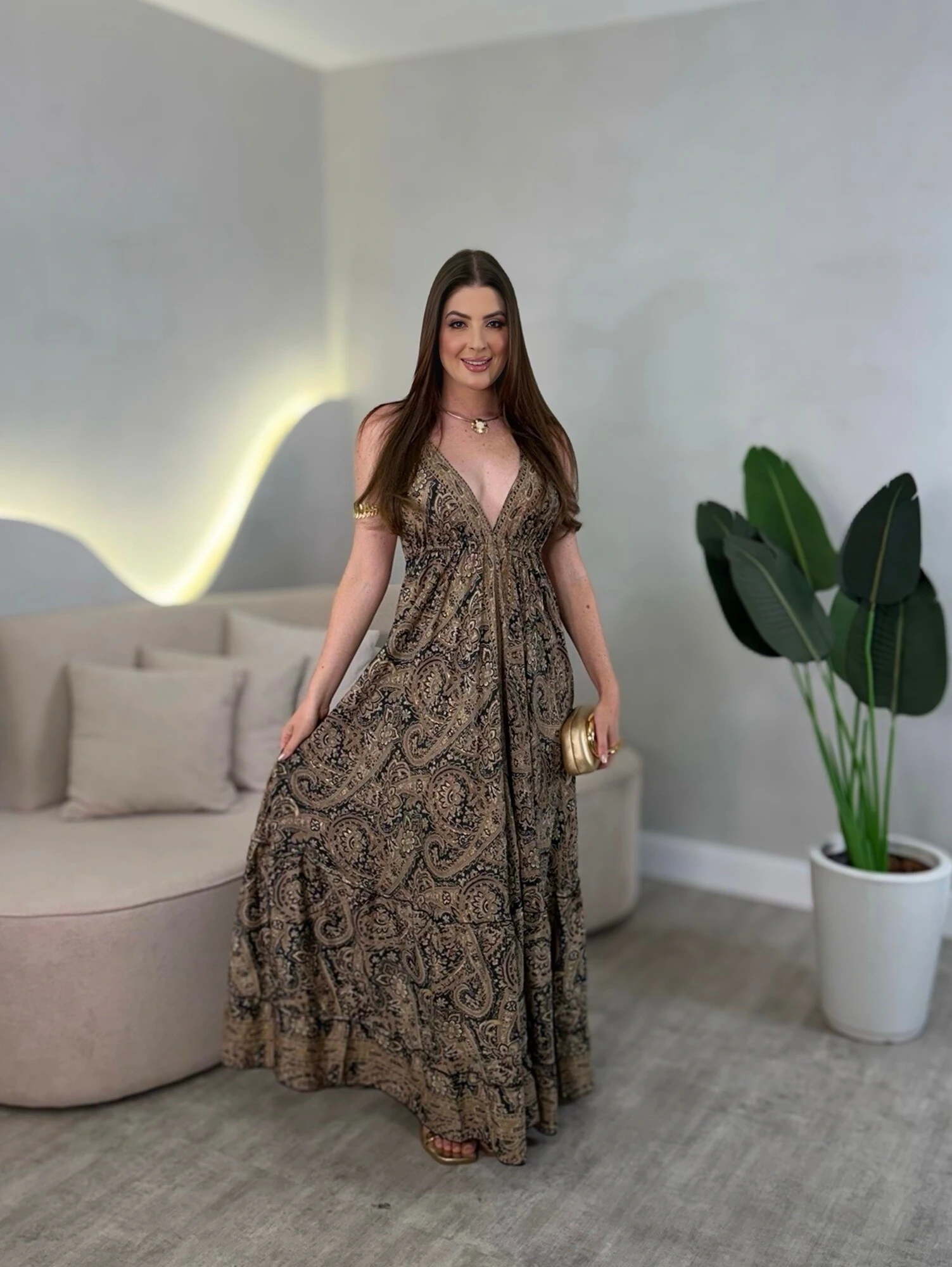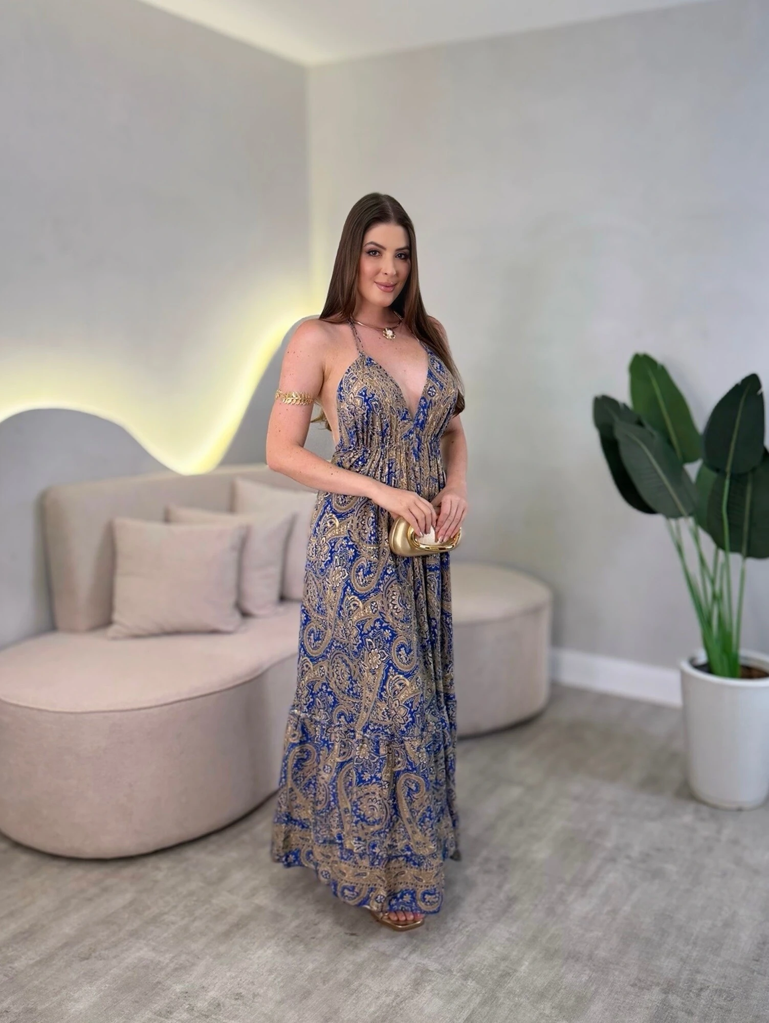 Vestido longo, com amarração no pescoço nas costas, modelagem solta.