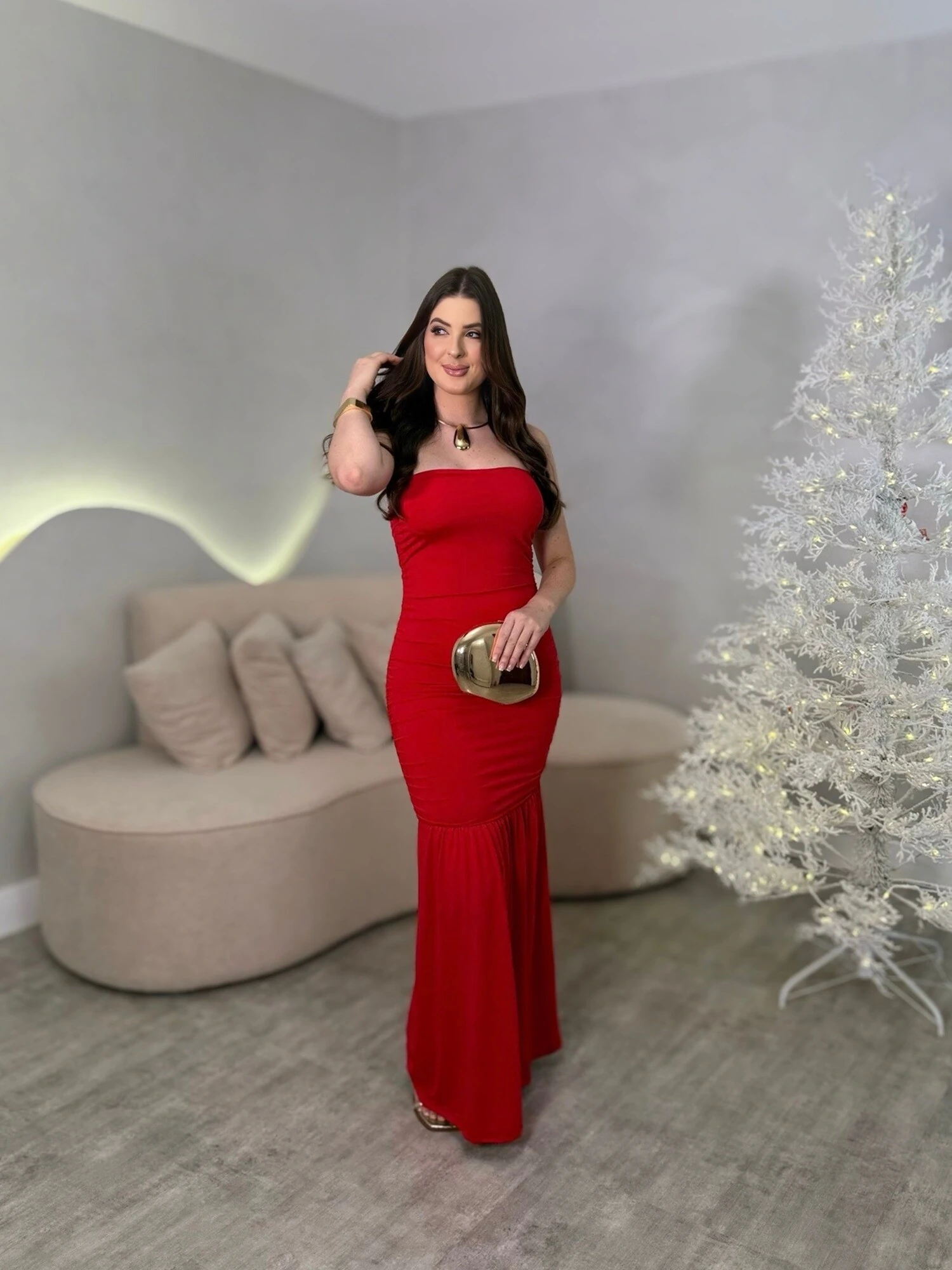 Vestido midi com bojo interno, detalhe drapeado nas laterais. Modelagem justa até a coxa e solto até o tornozelo.