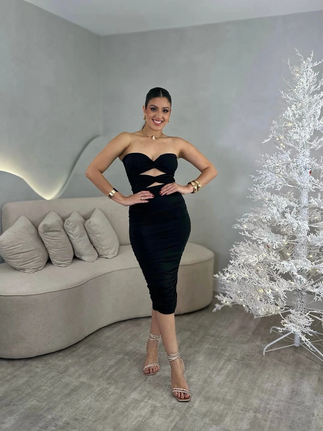 Vestido midi tomara que caia, com abertura na barriga. Drapeado na lateral, modelagem se ajusta ao corpo.