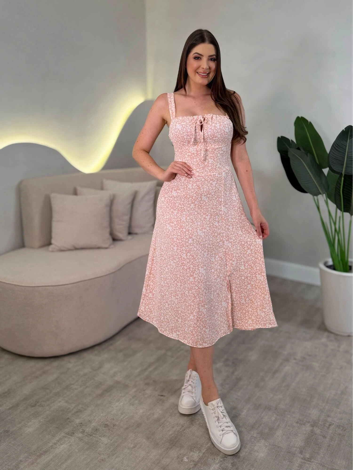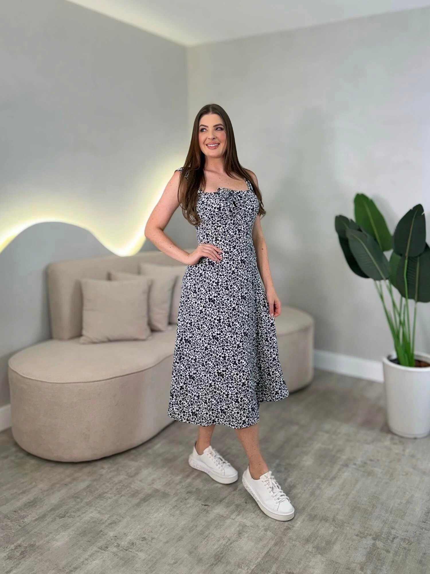 Vestido Florido Promo, Com Amarração No Busto. Modelagem Fluida e Solta.