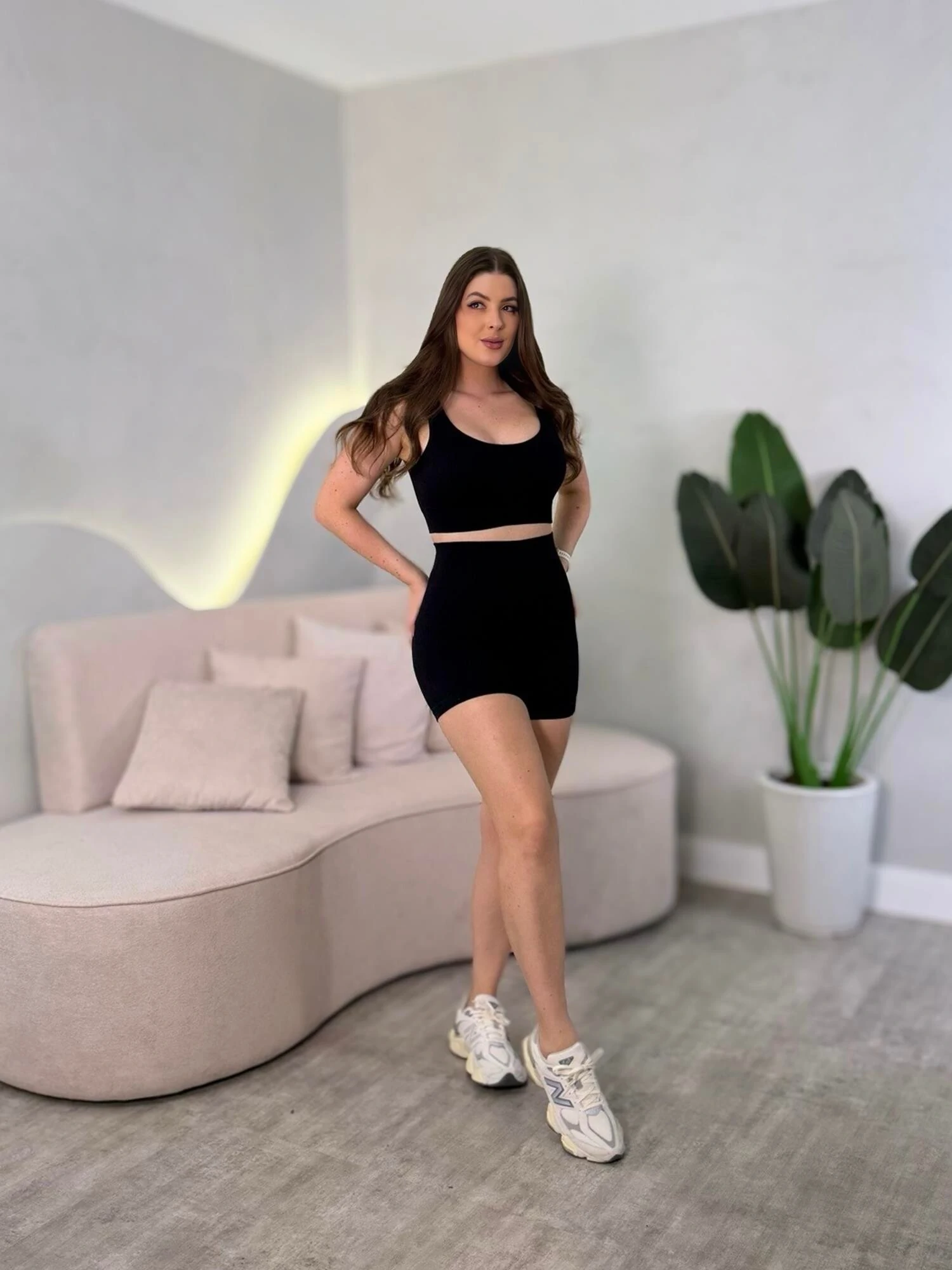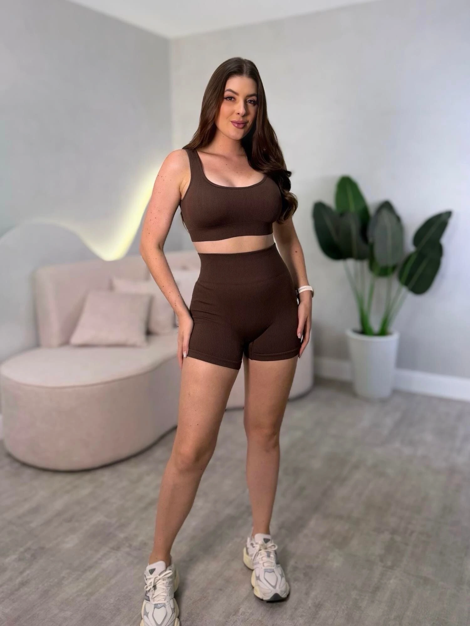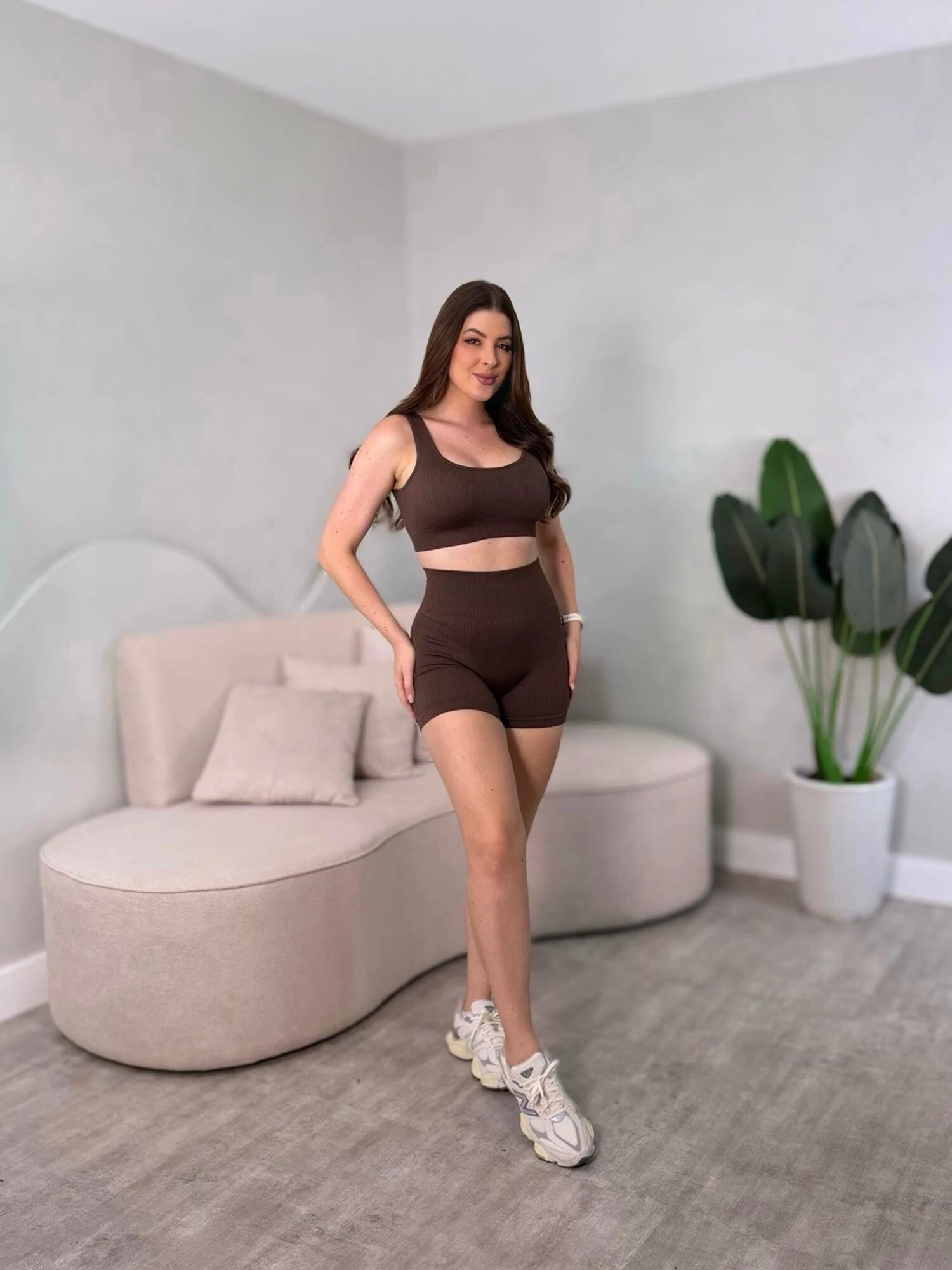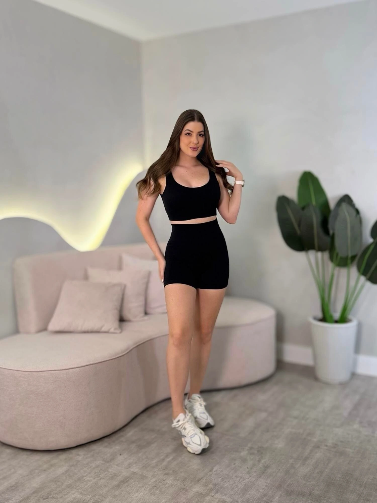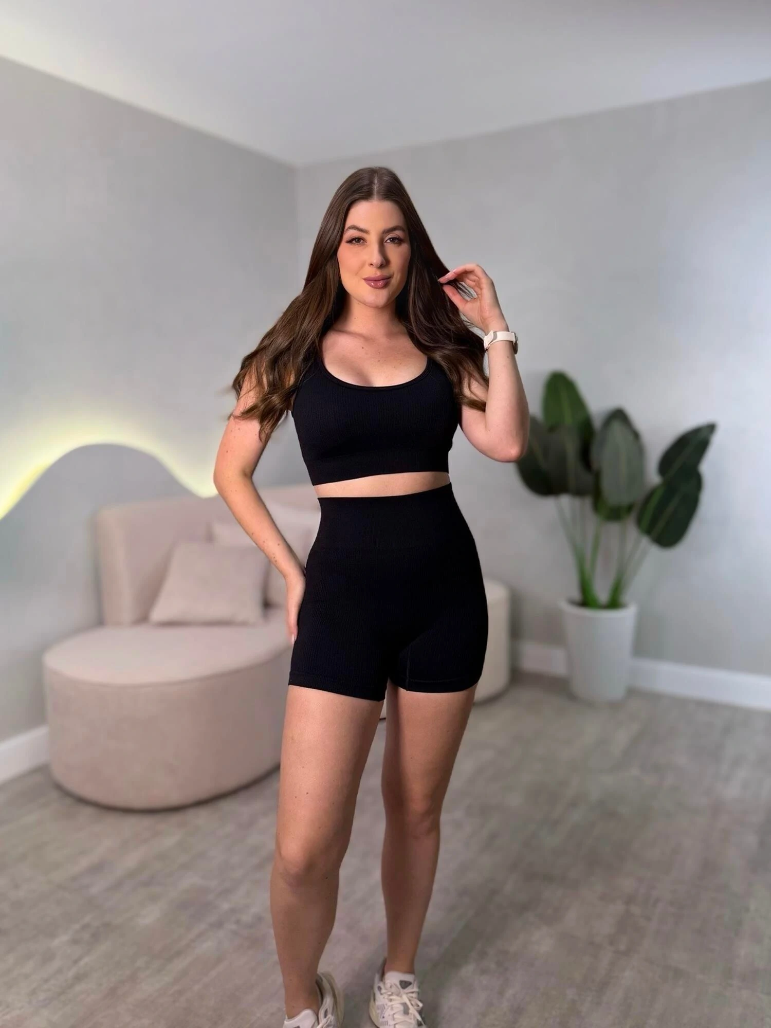 Conjunto de academia curto. Top com bojo, shorts com detalhe empina bumbum.
