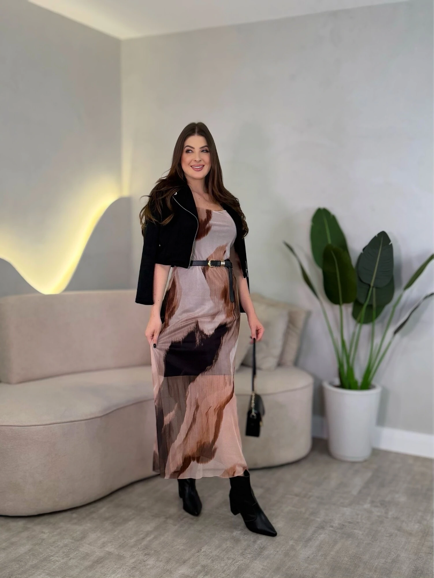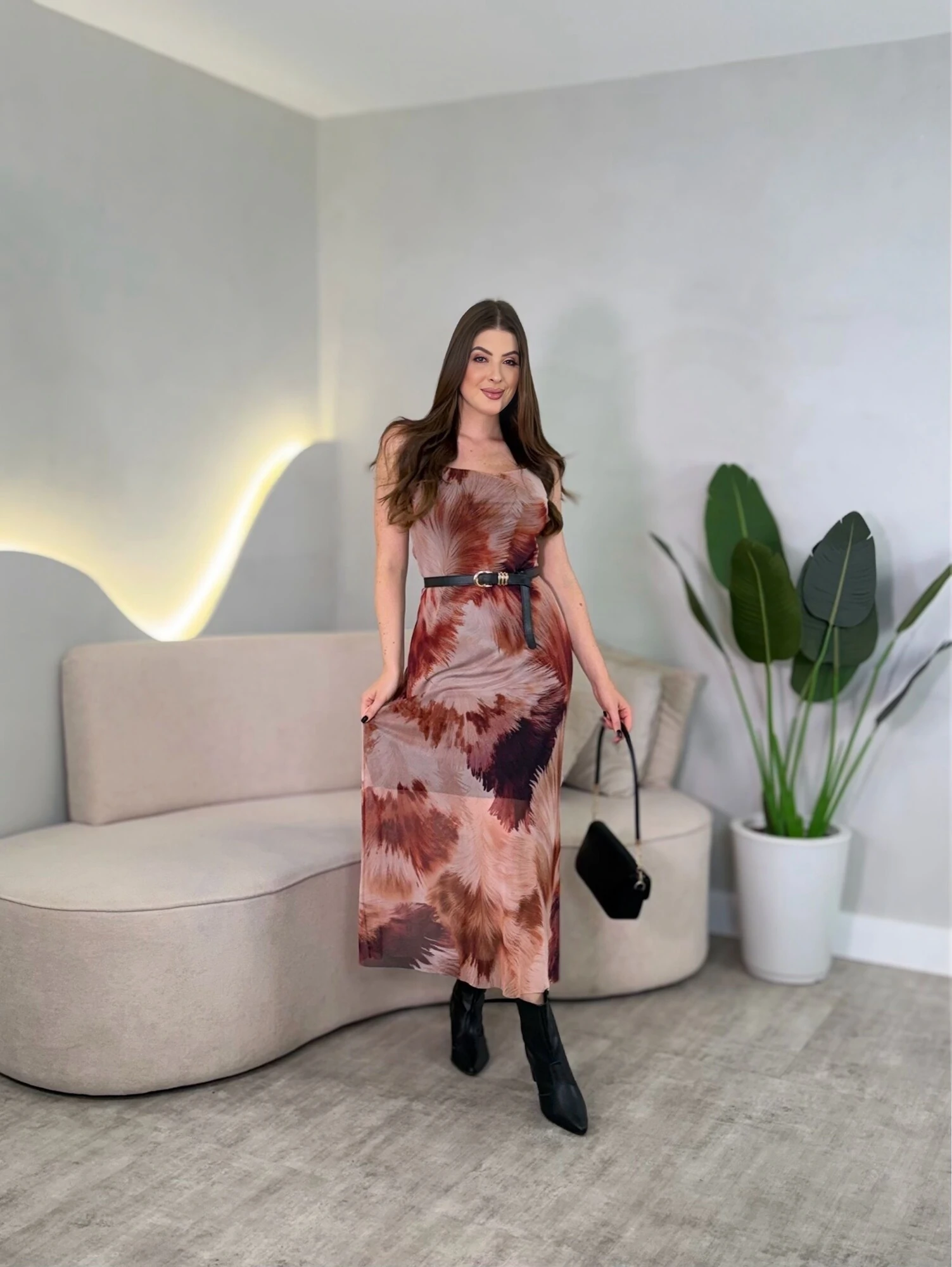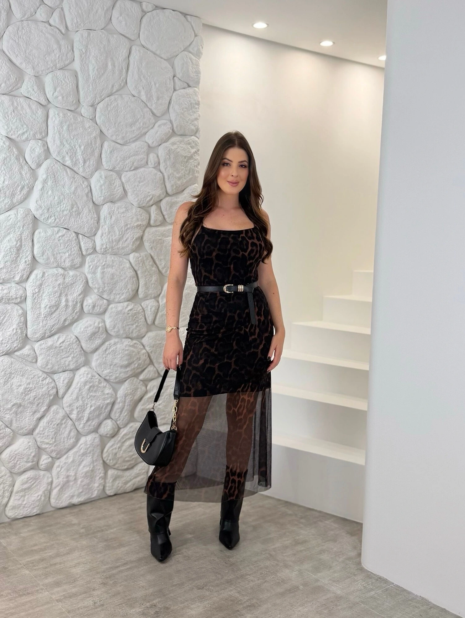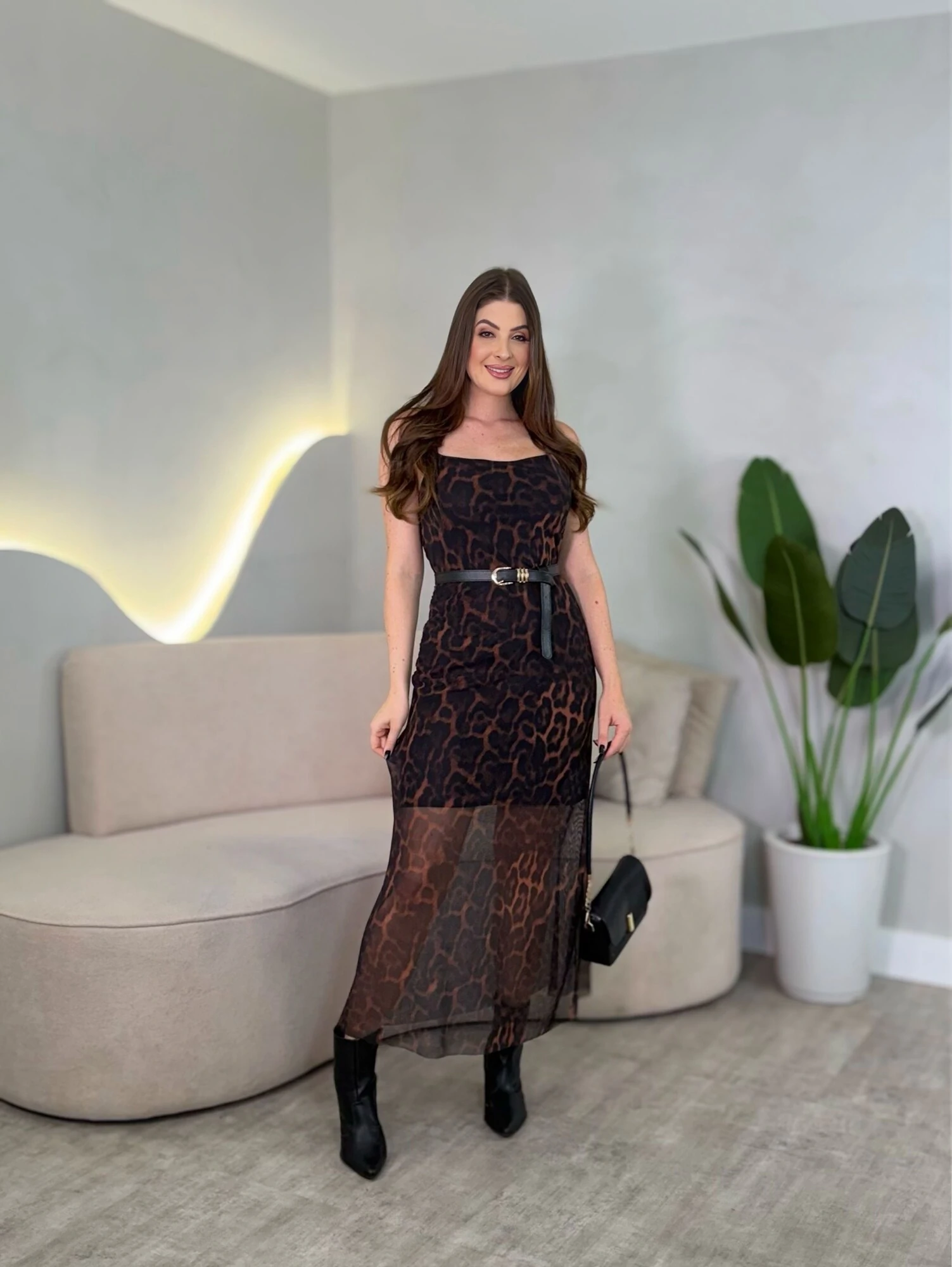Vestido com corte reto, alças com ajuste nas costas, forro interno. Modelagem se ajusta ao corpo.