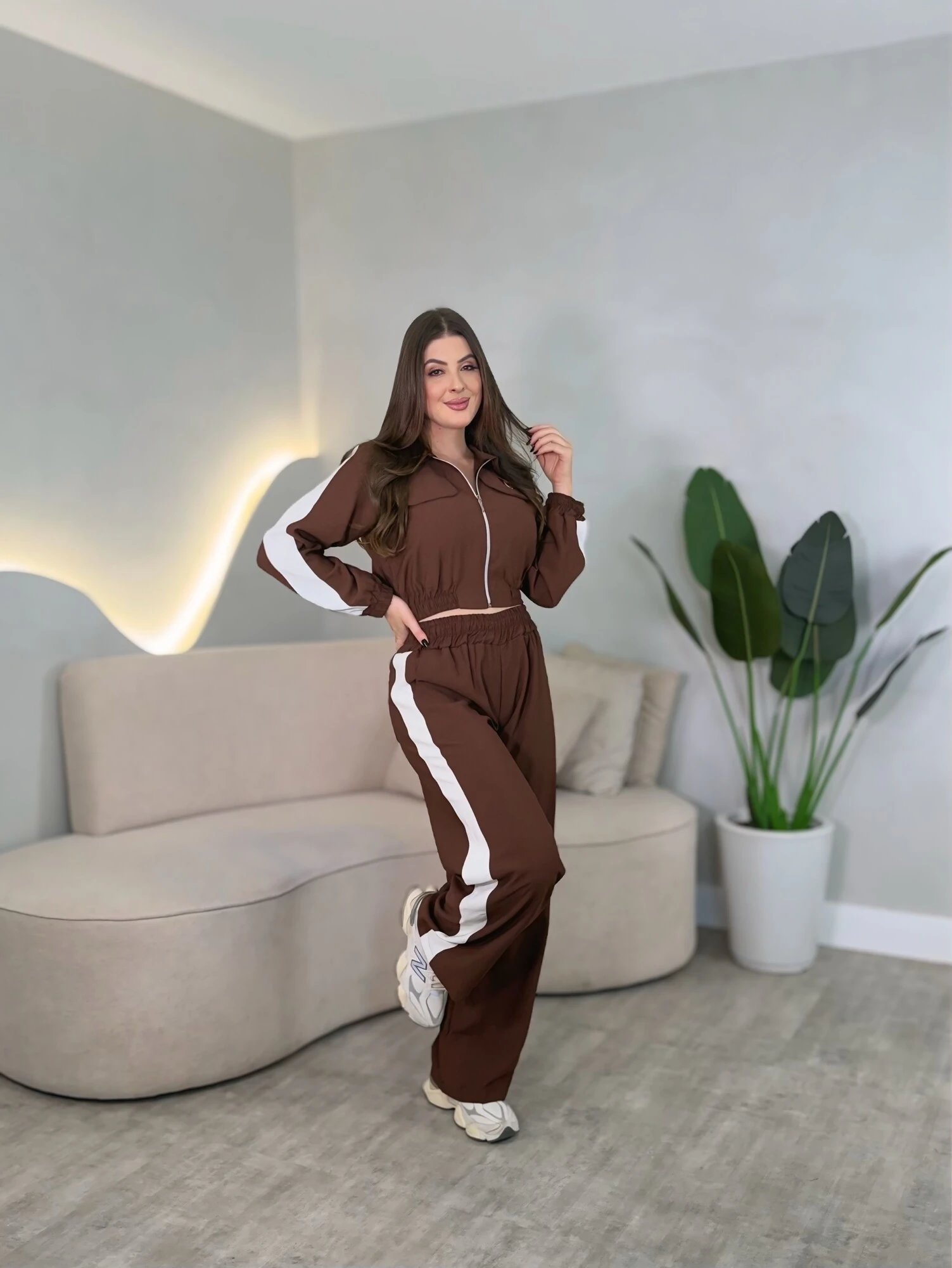 Conjunto composto por duas peças, jaquetinha com fecho em zíper na frente, com gola, detalhe em bolsos fake na frente, elástico na cintura e no punho, calça com elástico na cintura, detalhe em amarração na cintura, bolsos funcionais na frente e atrás. Modelagem solta.