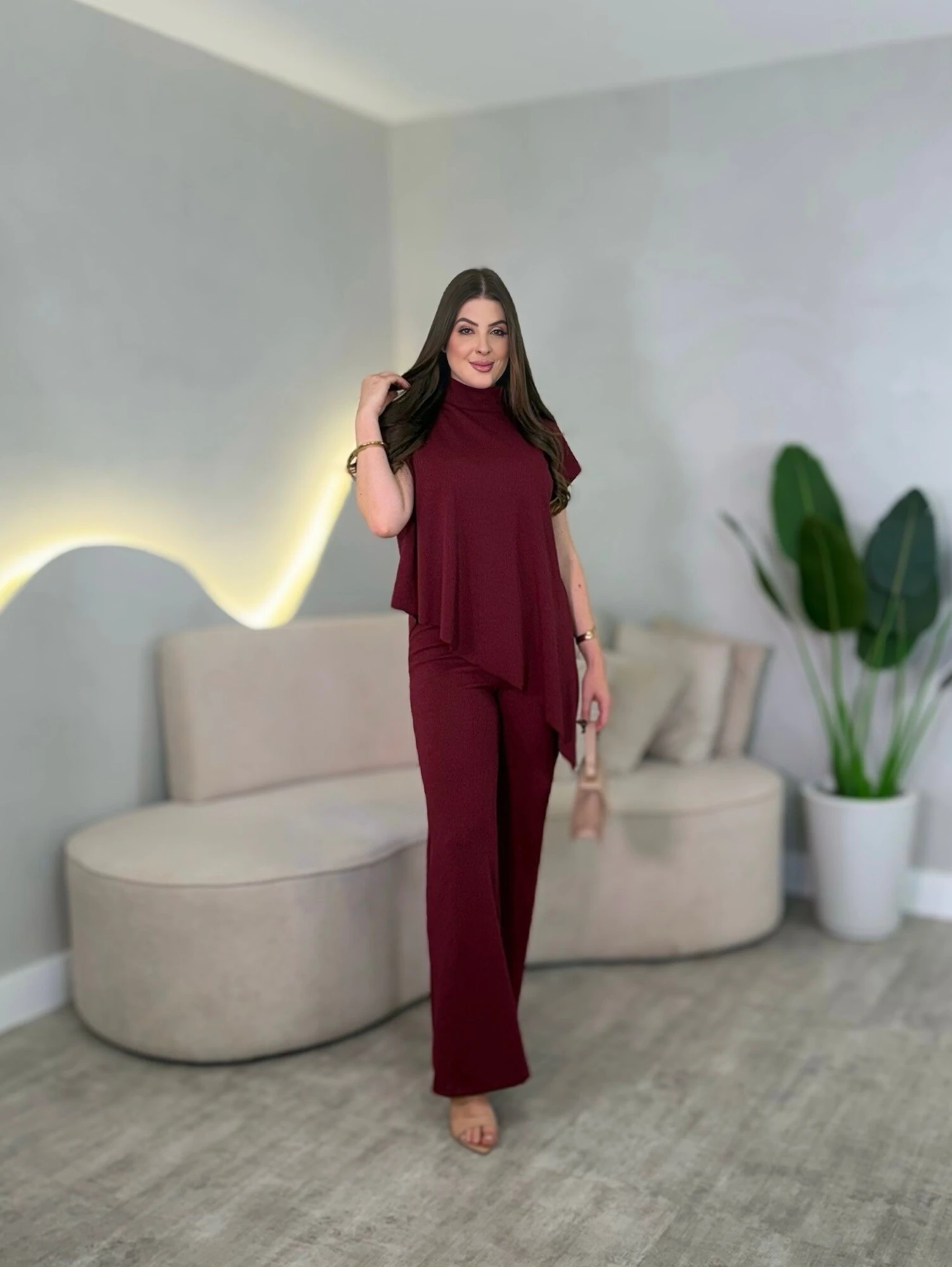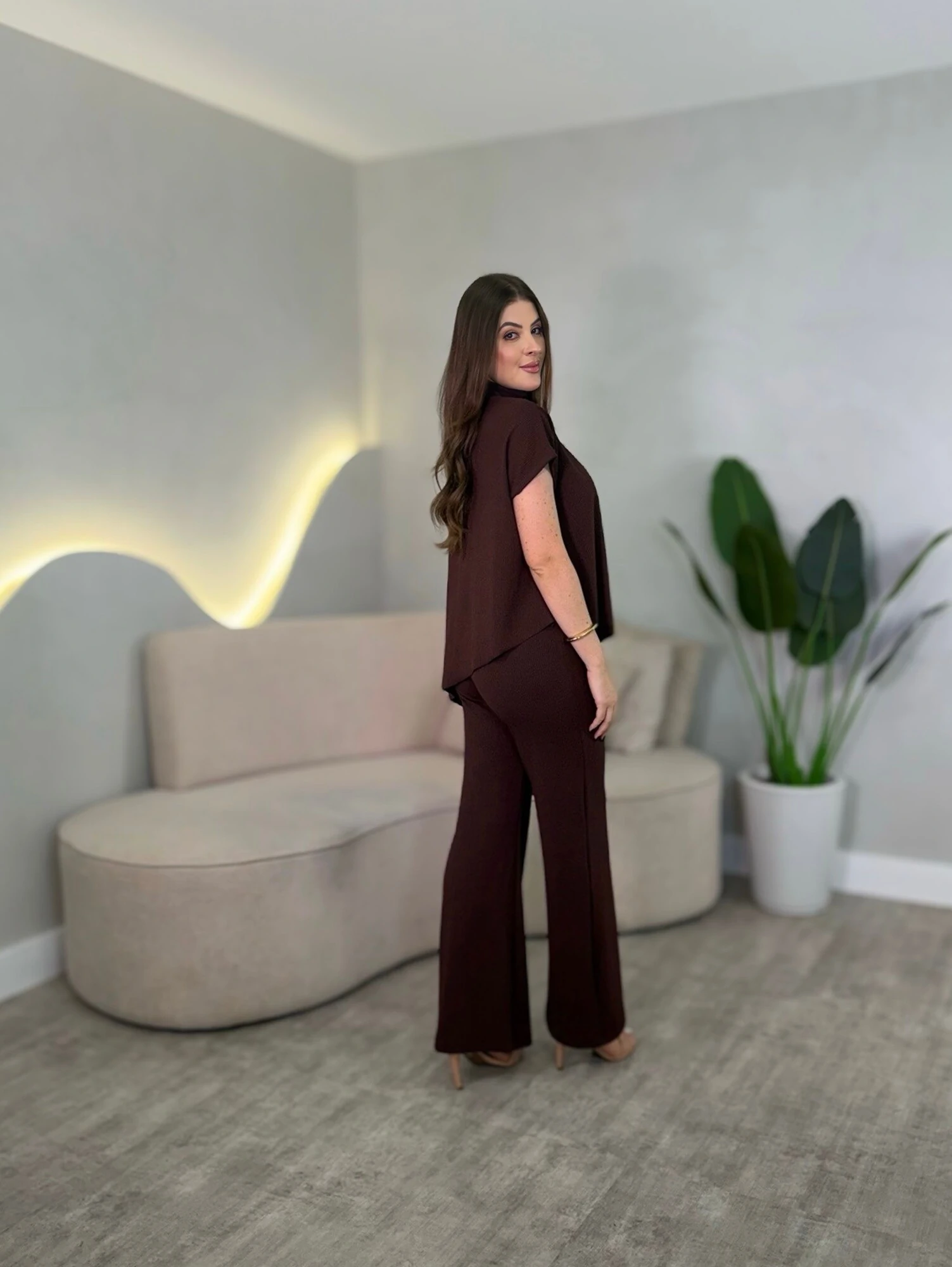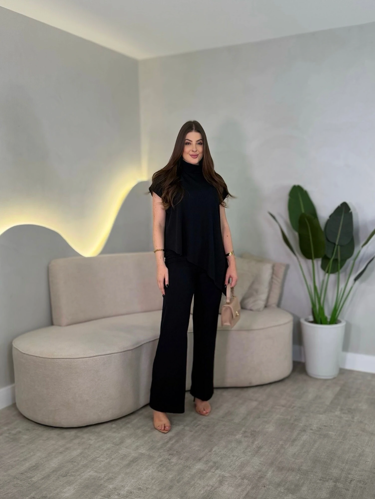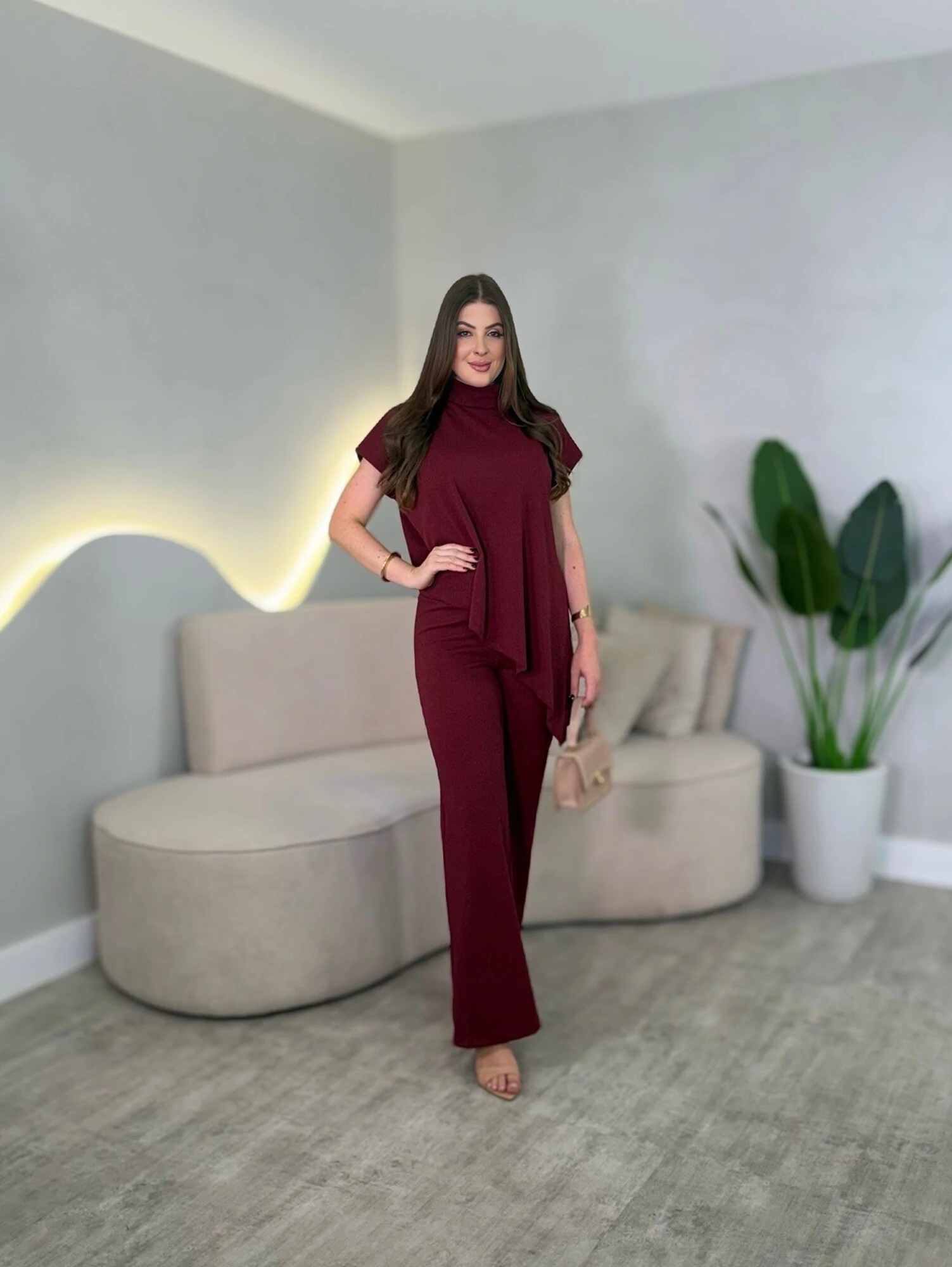 Conjunto composto por duas peças, blusa com gola alta, mangas curtas, recorte acimétrico, calça com elástico na cintura, bolsos na frente. Modelagem solta.