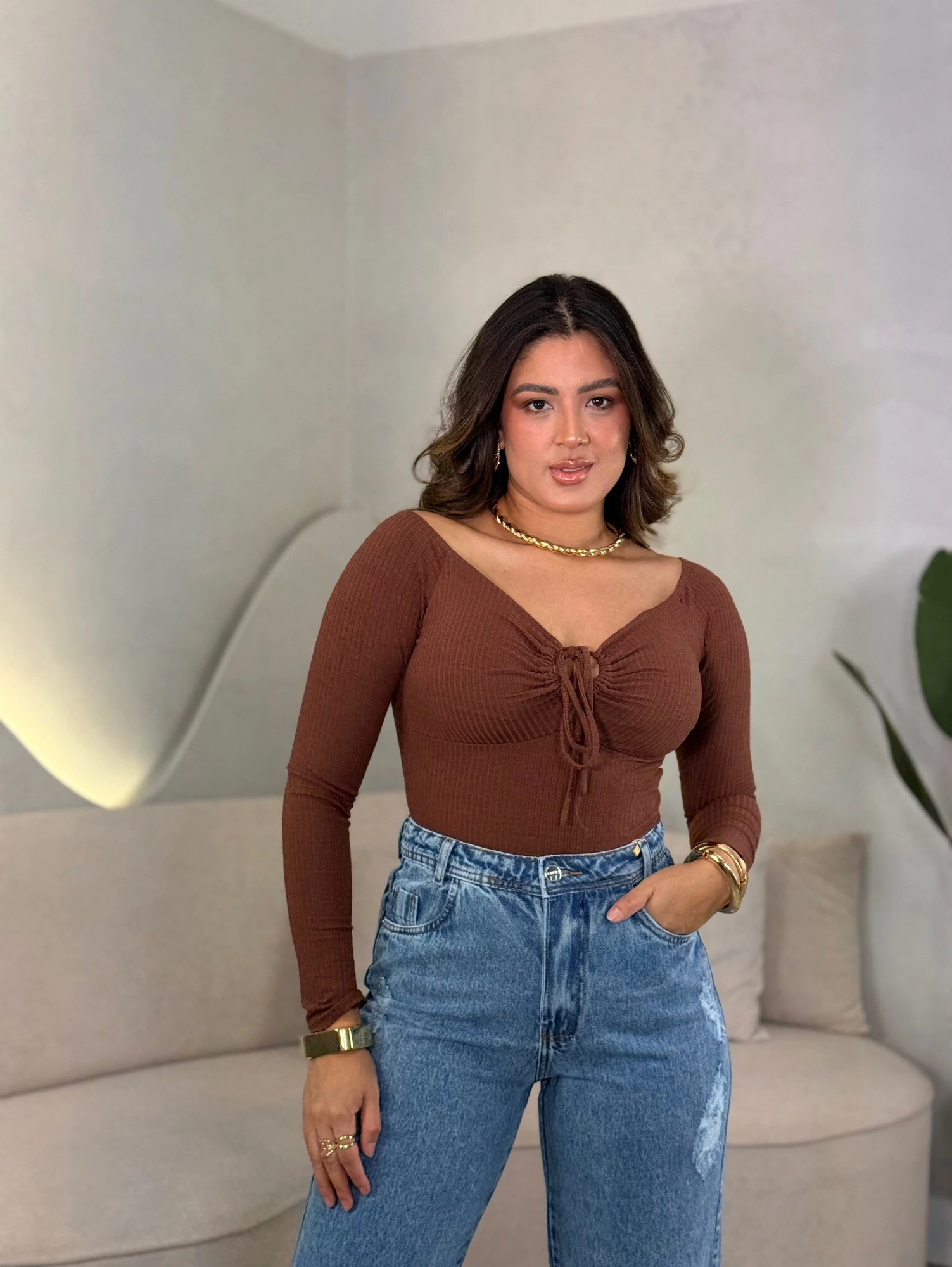 Body manga longa, com detalhe para amarração no peito, elástico nas costas, bojo interno, fecho colchetes em baixo. Modelagem se ajusta ao corpo.
