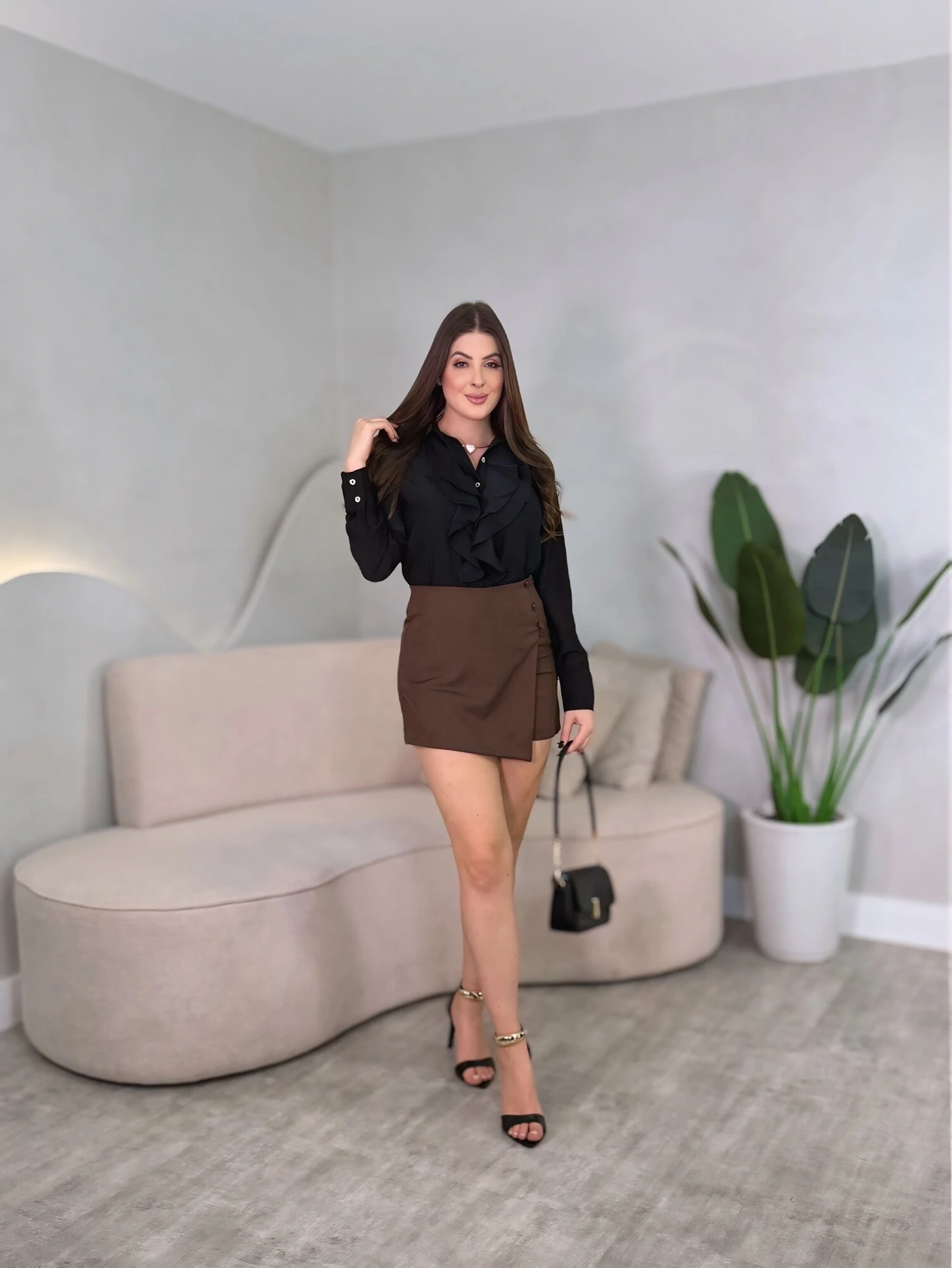 Shorts saia com detalhe em botões na lateral, fecho em zíper na lateral, modelagem se ajusta ao corpo.