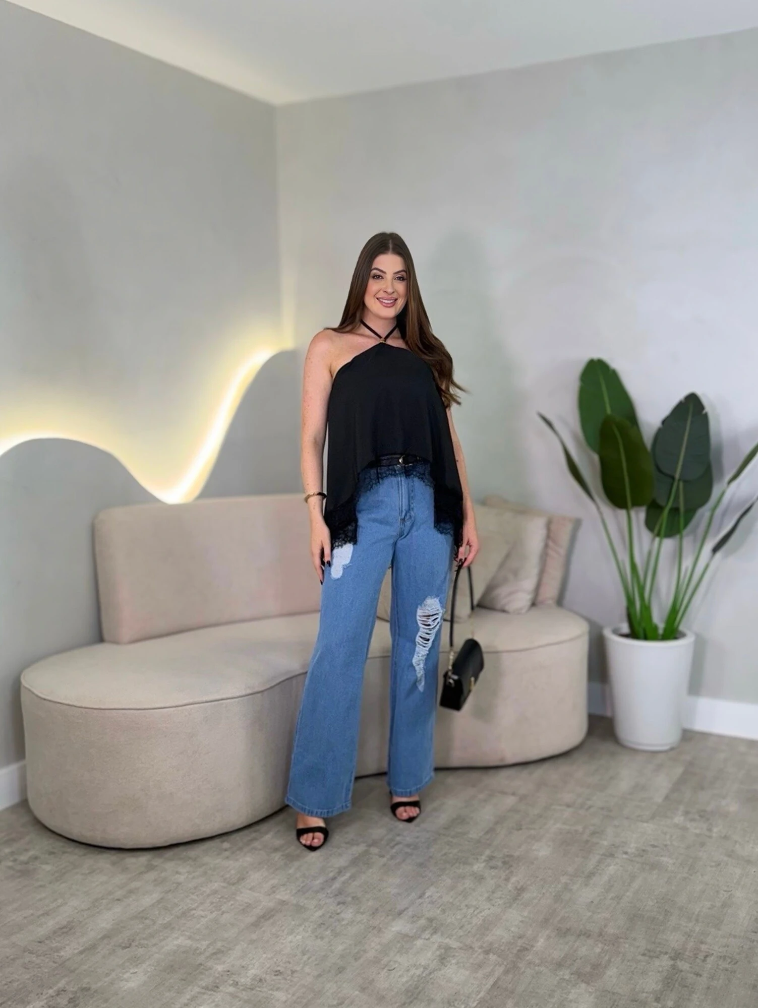 Bata com amarração no pescoço, detalhe em acessório no pescoço, detalhe em renda na barra. Modelagem solta.