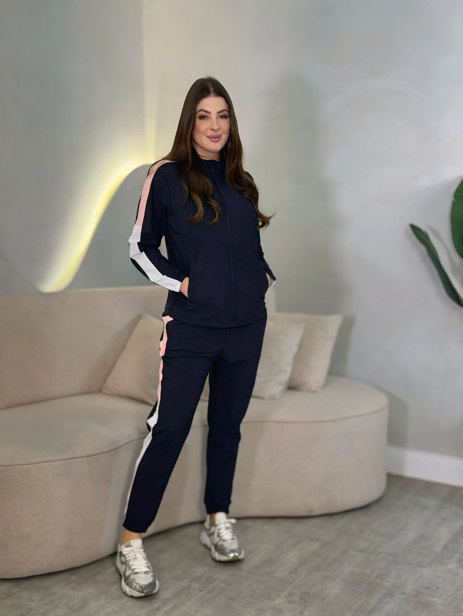 Conjunto composto por duas peças, blusa com capuz, fecho em zíper, ajuste no capuz, bolsos na frente, elástico para ajuste nos punhos, calça com elástico na cintura, ajuste na cintura, bolsos nas laterais com zíper, modelo jogger. Modelagem solta.