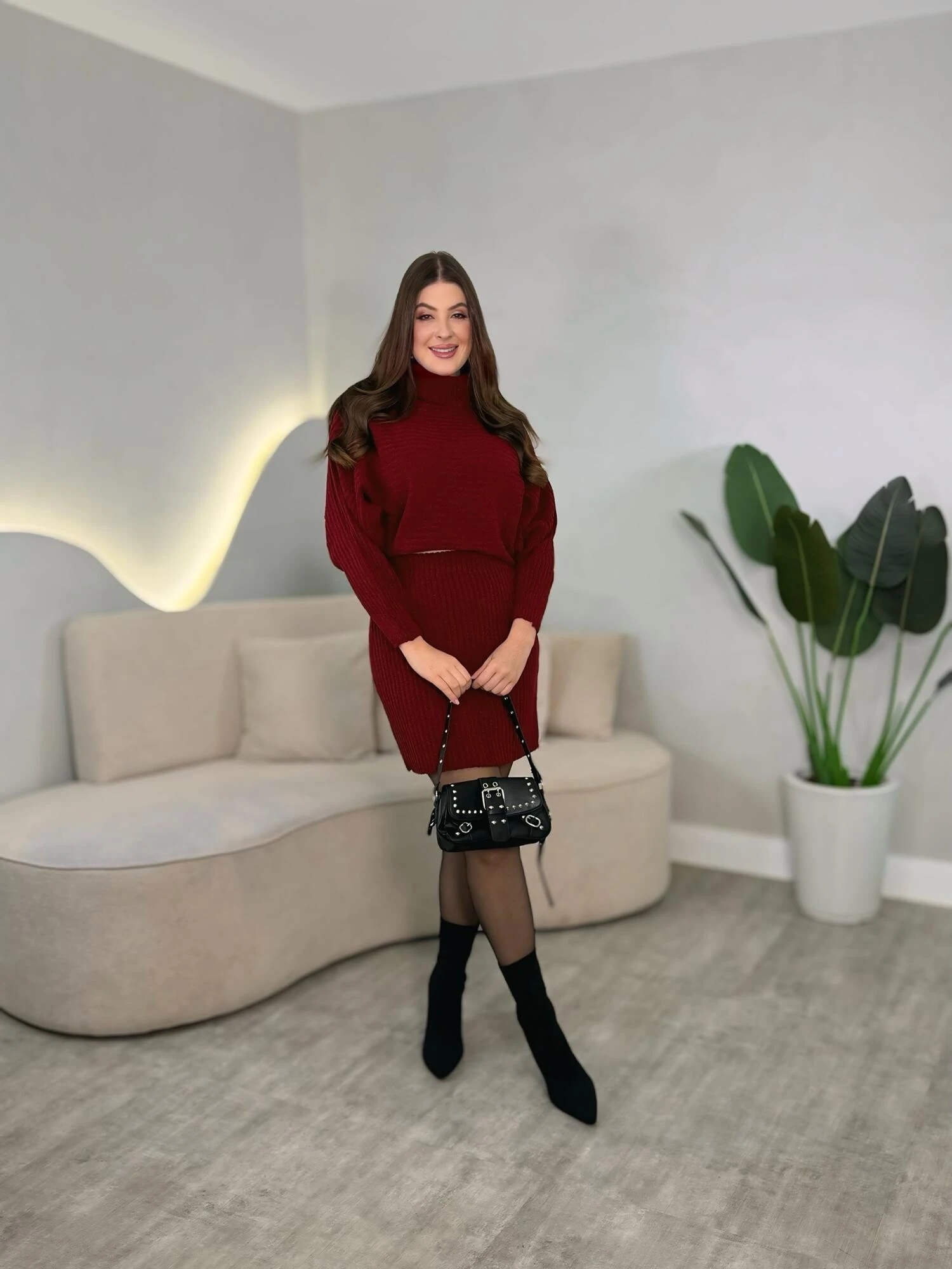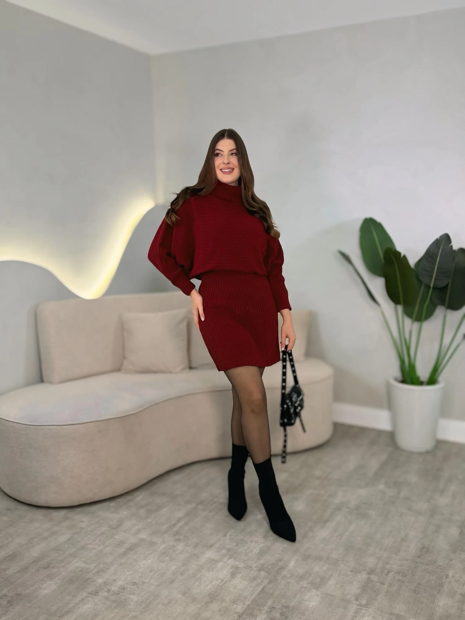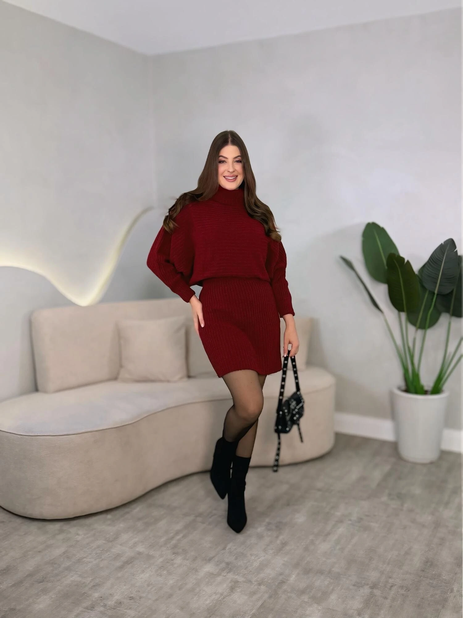 Conjunto composto por duas peças, blusa manga morcego com gola alta, modelagem solta, saia com elástico na cintura. Modelagem solta.