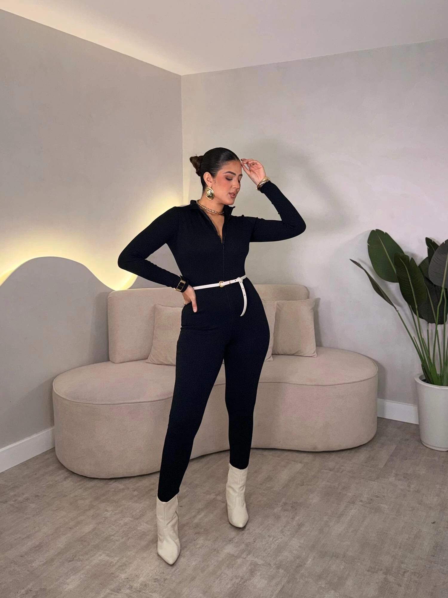 Macacão com fecho em zíper na frente, modelo com mangas longas e se ajusta ao corpo.