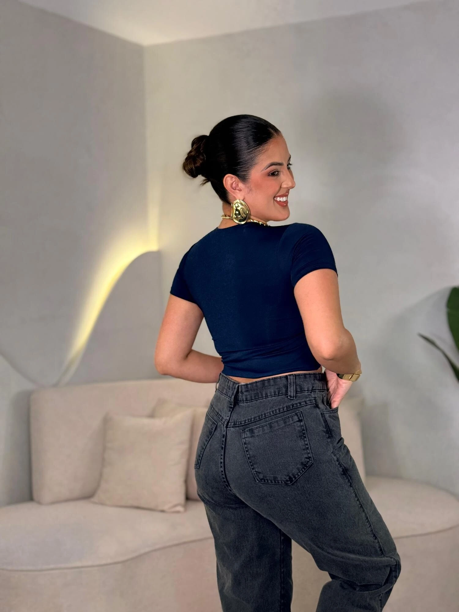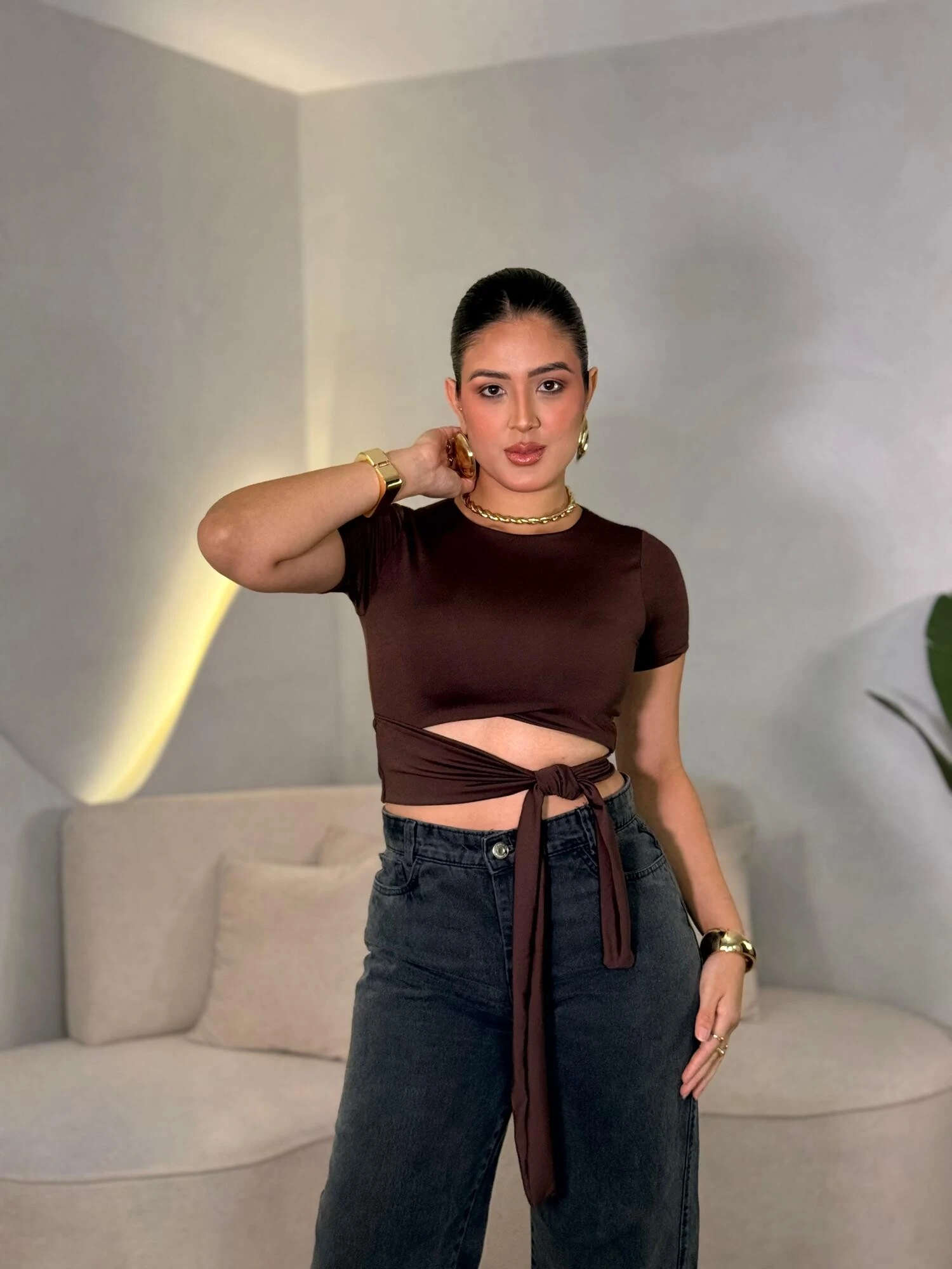 Cropped manga curta com amarração lateral na cintura. Modelagem se ajusta ao corpo.