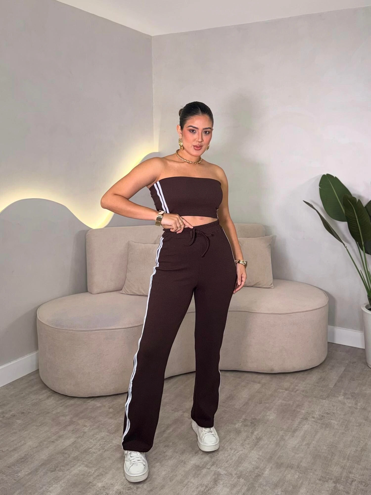 Conjunto composto por duas peças, cropped tomara que caia e calça pantalona. Modelagem com caimento solto.