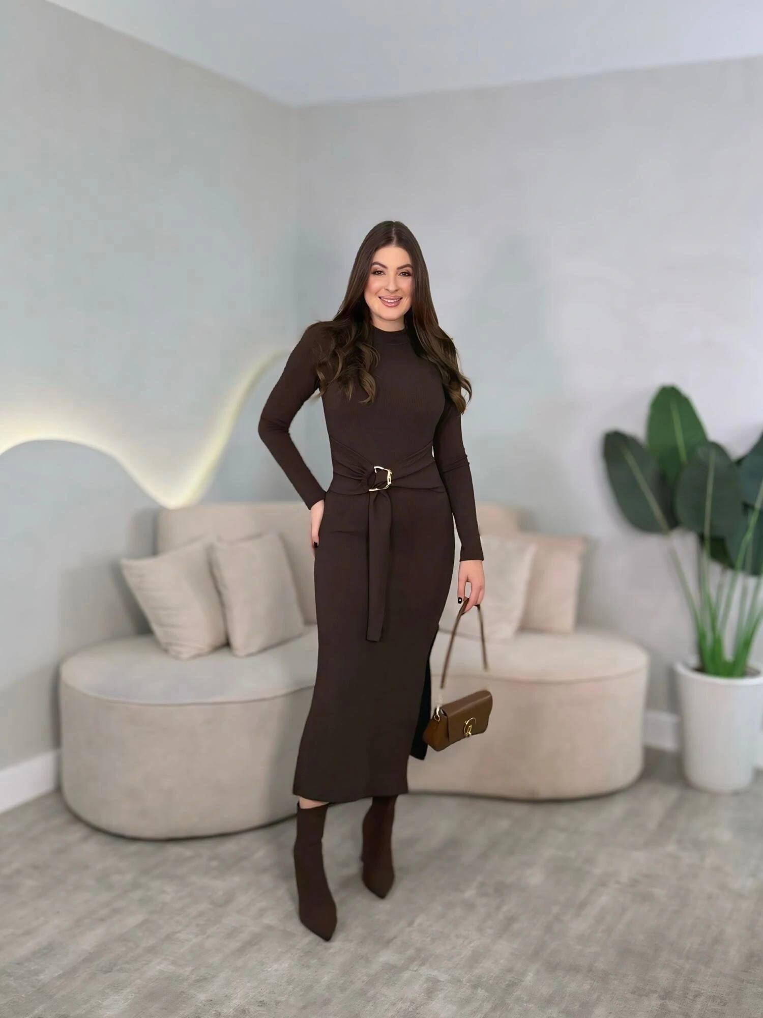 Vestido Longo Com Modelagem Justa + Cinto Fake Com Detalhe Dourado.